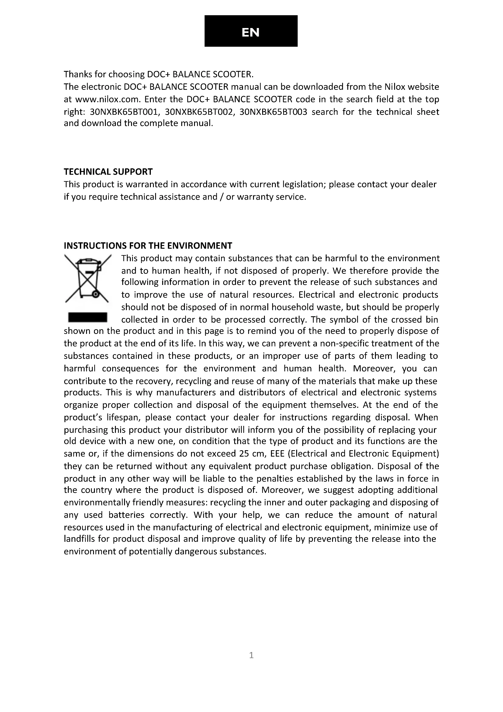 Thanks for choosing DOC+ BALANCE SCOOTER. The electronic DOC+ BALANCE SCOOTER manual can be downloaded from the Nilox website at www.nilox.com. Enter the DOC+ BALANCE SCOOTER code in the search field at the top right: 30NXBK65BT001, 30NXBK65BT002, 30NXBK65BT003 search for the technical sheet and download the complete manual.