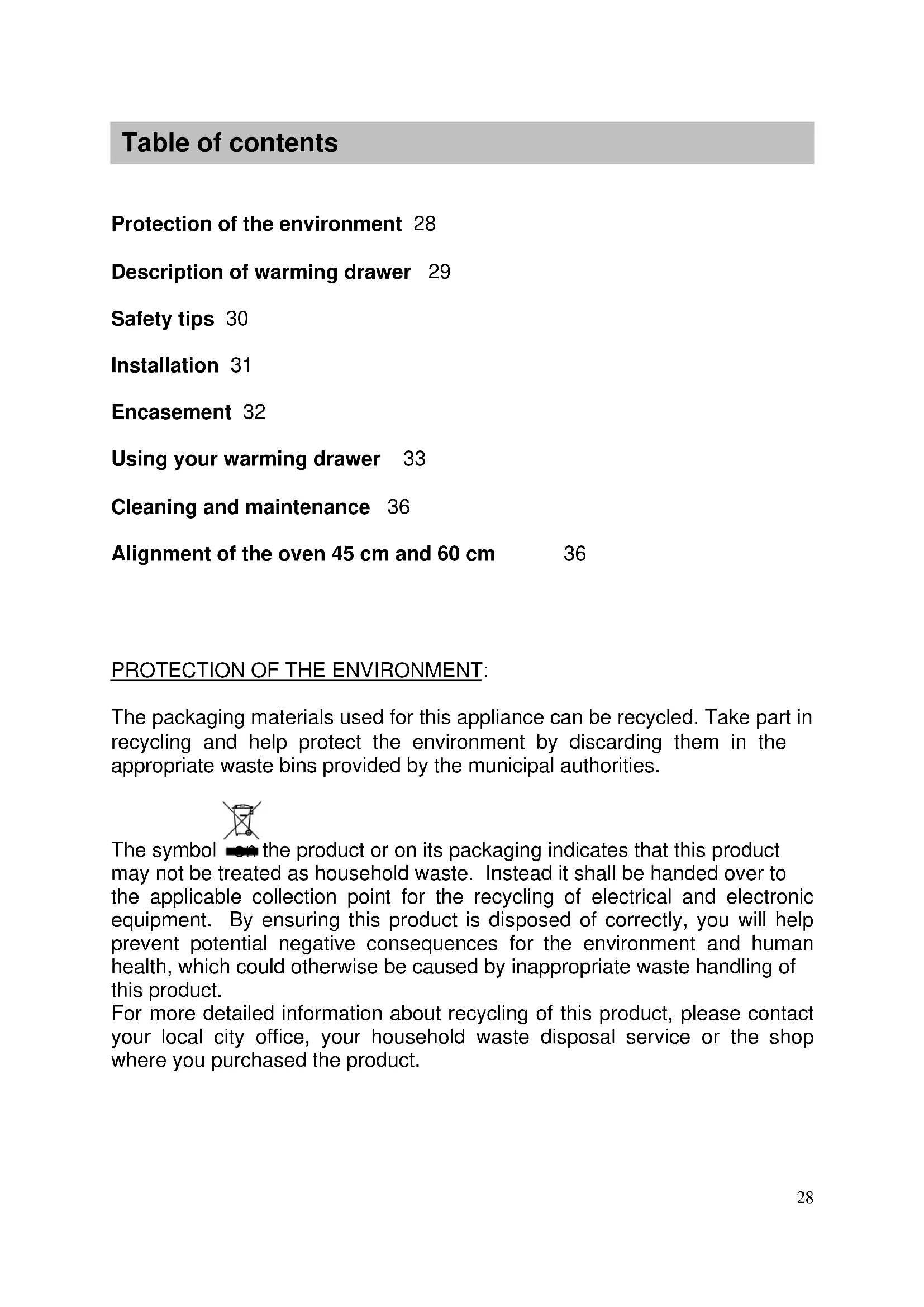 This warming drawer has been designed for use by private persons in their homes. It is intended exclusively for warming dishes. Any other use is prohibited and could be dangerous. The manufacturer cannot be held liable in the event of non-complying use.