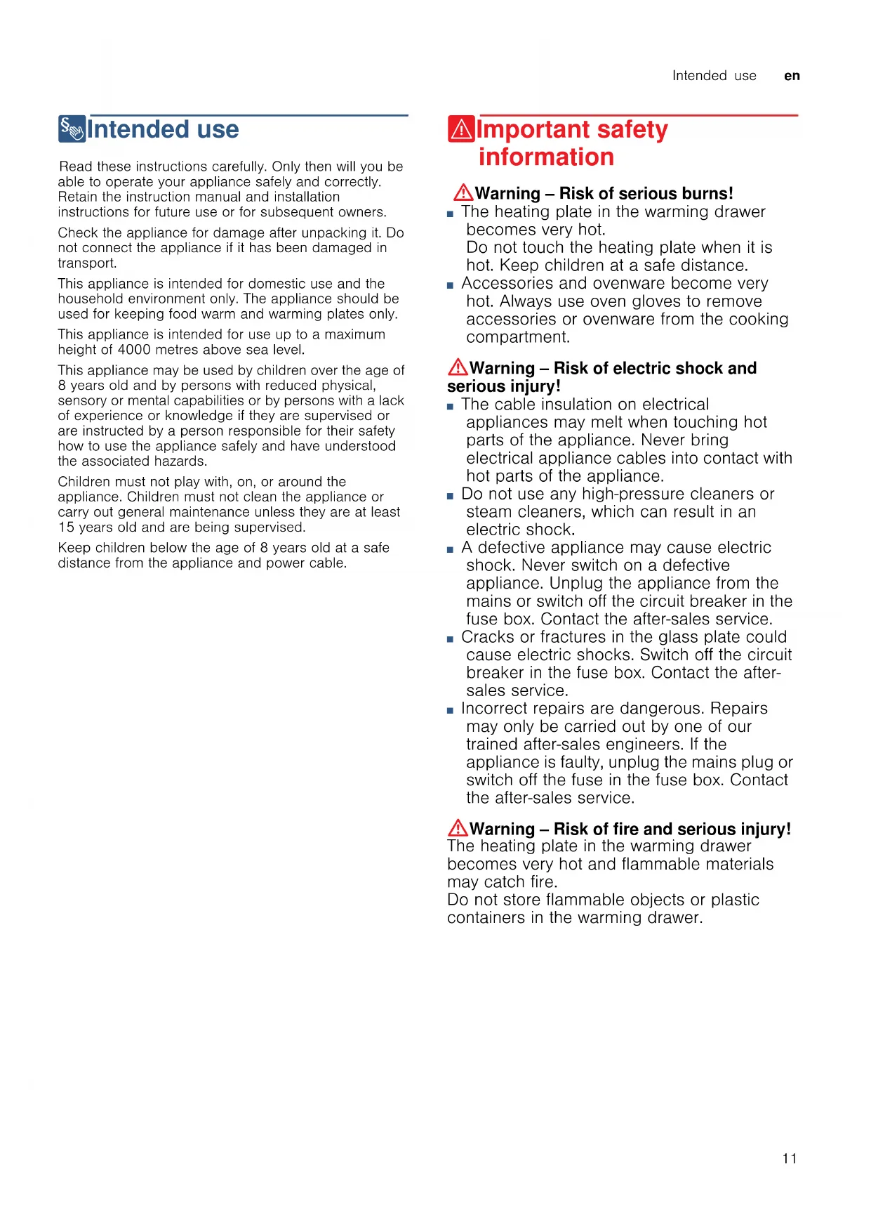 8Intended use Intended use Read these instructions carefully. Only then will you be able to operate your appliance safely and correctly. Retain the instruction manual and installation instructions for future use or for subsequent owners. Check the appliance for damage after unpacking it. Do not connect the appliance if it has been damaged in transport. This appliance is intended for domestic use and the household environment only. The appliance should be used for keeping food warm and warming plates only. This appliance is intended for use up to a maximum height of 4000 metres above sea level. This appliance may be used by children over the age of 8 years old and by persons with reduced physical, sensory or mental capabilities or by persons with a lack of experience or knowledge if they are supervised or are instructed by a person responsible for their safety how to use the appliance safely and have understood the associated hazards. Children must not play with, on, or around the appliance. Children must not clean the appliance or carry out general maintenance unless they are at least 15 years old and are being supervised. Keep children below the age of 8 years old at a safe distance from the appliance and power cable. (Important safety information Impor t ant saf et y informat i on :Warning – Risk of serious burns! ■ The heating plate in the warming drawer becomes very hot. Do not touch the heating plate when it is hot. Keep children at a safe distance. Risk of serious burns! ■ Accessories and ovenware become very hot. Always use oven gloves to remove accessories or ovenware from the cooking compartment. :Warning – Risk of electric shock and serious injury! ■ The cable insulation on electrical appliances may melt when touching hot parts of the appliance. Never bring electrical appliance cables into contact with hot parts of the appliance. Risk of electric shock! ■ Do not use any high-pressure cleaners or steam cleaners, which can result in an electric shock. Risk of electric shock! ■ A defective appliance may cause electric shock. Never switch on a defective appliance. Unplug the appliance from the mains or switch off the circuit breaker in the fuse box. Contact the after-sales service. Risk of electric shock! ■ Cracks or fractures in the glass plate could cause electric shocks. Switch off the circuit breaker in the fuse box. Contact the after- sales service. Risk of electric shock! ■ Incorrect repairs are dangerous. Repairs may only be carried out by one of our trained after-sales engineers. If the appliance is faulty, unplug the mains plug or switch off the fuse in the fuse box. Contact the after-sales service. :Warning – Risk of fire and serious injury! The heating plate in the warming drawer becomes very hot and flammable materials may catch fire. Do not store flammable objects or plastic containers in the warming drawer.en Getting to know your appliance