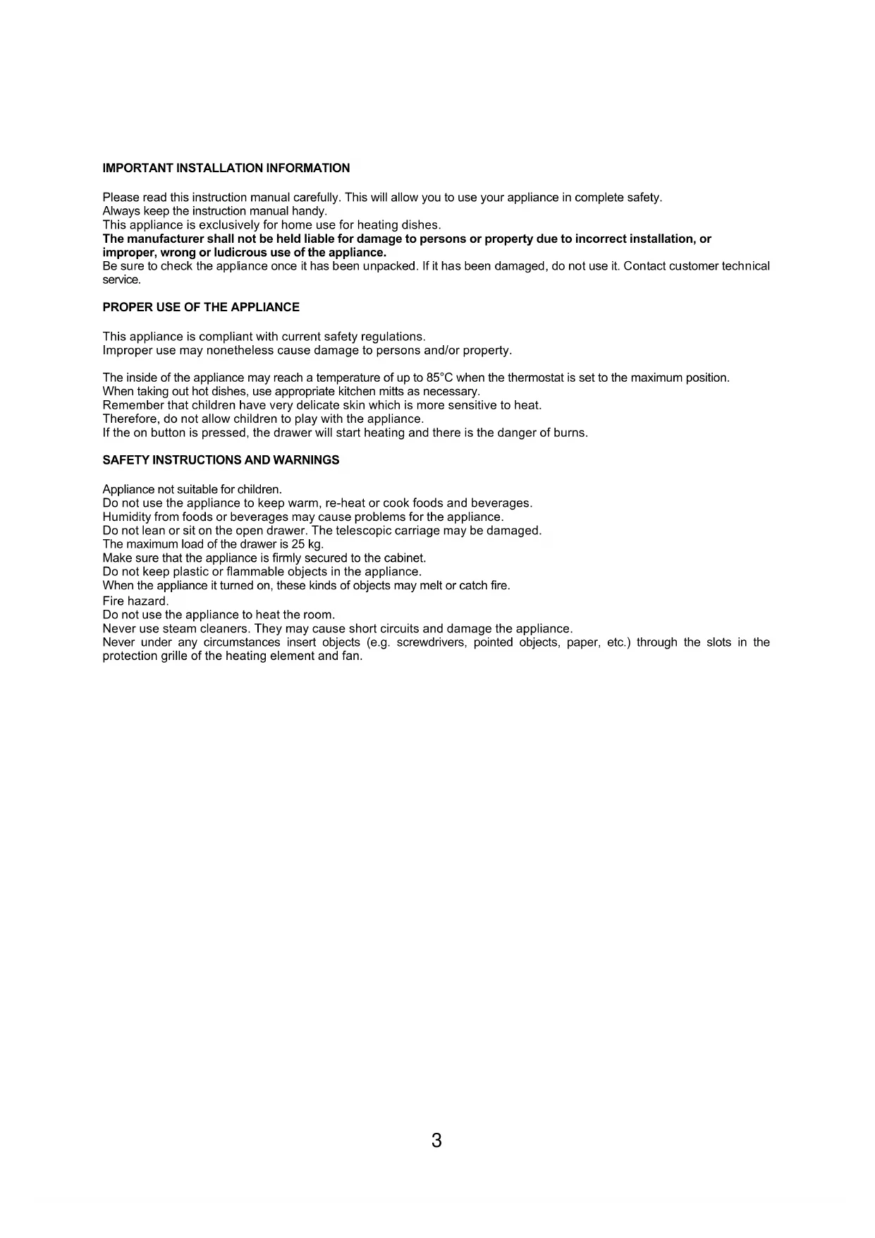 Appliance not suitable for children. Do not use the appliance to keep warm, re-heat or cook foods and beverages. Humidity from foods or beverages may cause problems for the appliance. Do not lean or sit on the open drawer. The telescopic carriage may be damaged. The maximum load of the drawer is 25 kg. Make sure that the appliance is firmly secured to the cabinet. Do not keep plastic or flammable objects in the appliance. When the appliance it turned on, these kinds of objects may melt or catch fire. Fire hazard. Do not use the appliance to heat the room. Never use steam cleaners. They may cause short circuits and damage the appliance. Never under any circumstances insert objects (e.g. screwdrivers, pointed objects, paper, etc.) through the slots in the protection grille of the heating element and fan.