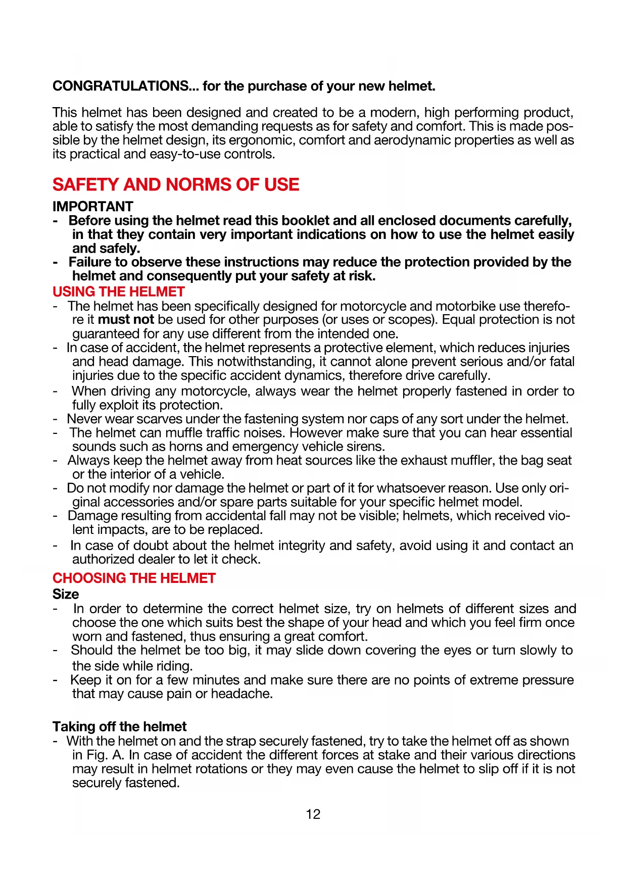 Size - In order to determine the correct helmet size, try on helmets of different sizes and choose the one which suits best the shape of your head and which you feel rm once worn and fastened, thus ensuring a great comfort. - Should the helmet be too big, it may slide down covering the eyes or turn slowly to the side while riding. - Keep it on for a few minutes and make sure there are no points of extreme pressure that may cause pain or headache. Taking off the helmet - With the helmet on and the strap securely fastened, try to take the helmet off as shown in Fig. A. In case of accident the different forces at stake and their various directions may result in helmet rotations or they may even cause the helmet to slip off if it is not securely fastened.13 - The helmet should not rotate nor move on the head and should not slide off. Should the contrary happen, adjust strap length or change helmet size. Repeat test. Retention System - The retention system (strap) is factory-adjusted at a standard length. Before use, check that it is correctly pre-adjusted. - Make sure the strap is properly fastened and tightened so as to keep the helmet rmly in place. Anyway, before riding, make sure that the strap is well fastened under the chin, as close as possible to the throat, but without being uncomfortable. - The correct strap tension should allow normal breathing and swallowing, but without leaving the space of a nger between strap and throat. - Attention: the button which may be present on the strap only prevents its end from apping once the strap has been fastened properly. VISOR - If the visor is damaged or deeply scratched causing reduced visibility, this means that the protective treatment is probably damaged so the visor is to be replaced. - The visor can be used only for the intended helmet model. - Do not paint nor apply stickers.