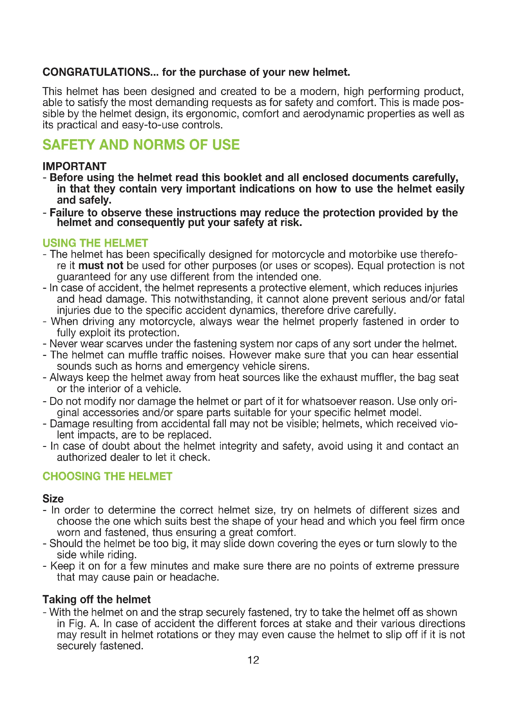 Size - In order to determine the correct helmet size, try on helmets of different sizes and choose the one which suits best the shape of your head and which you feel firm once worn and fastened, thus ensuring a great comfort. - Should the helmet be too big, it may slide down covering the eyes or turn slowly to the side while riding. - Keep it on for a few minutes and make sure there are no points of extreme pressure that may cause pain or headache. Taking off the helmet - With the helmet on and the strap securely fastened, try to take the helmet off as shown in Fig. A. In case of accident the different forces at stake and their various directions may result in helmet rotations or they may even cause the helmet to slip off if it is not securely fastened.13 ENGLISH - The helmet should not rotate nor move on the head and should not slide off. Should the contrary happen, adjust strap length or change helmet size. Repeat test. Retention System - The retention system (strap) is factory-adjusted at a standard length. Before use, check that it is correctly pre-adjusted. - Make sure the strap is properly fastened and tightened so as to keep the helmet firmly in place. Anyway, before riding, make sure that the strap is well fastened under the chin, as close as possible to the throat, but without being uncomfortable. - The correct strap tension should allow normal breathing and swallowing, but without leaving the space of a finger between strap and throat. - Attention: the button which may be present on the strap only prevents its end from flapping once the strap has been fastened properly. VISOR - If the visor is damaged or deeply scratched causing reduced visibility, this means that the protective treatment is probably damaged so the visor is to be replaced. - The visor can be used only for the intended helmet model. - Do not paint nor apply stickers.