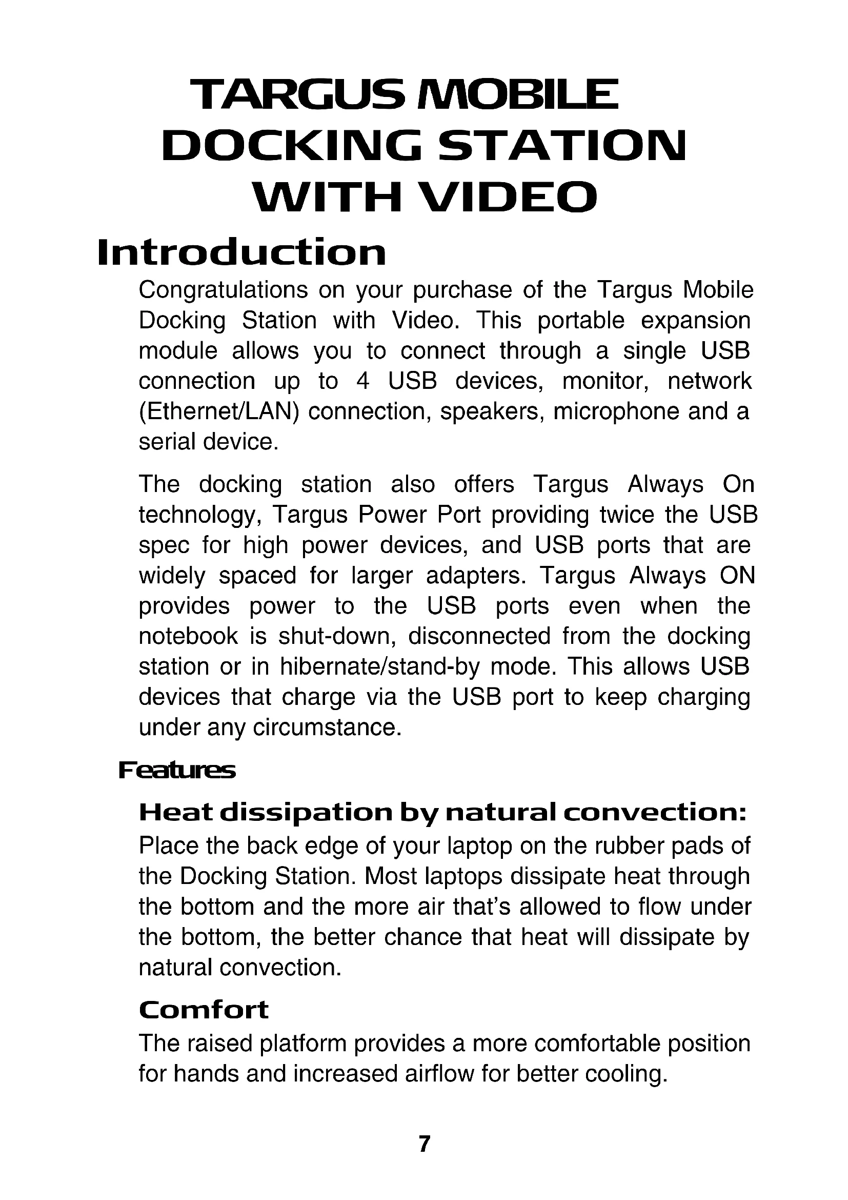 software, matches the setting on the docking station. To verify the COM port setting on the docking station, refer to “Verifying Devices are Installed” on page 17. To verify the COM port setting on your PDA, refer to the documentation that came with it. Connecting to a Local Area Network To connect an ethernet cable with RJ-45 connect, attach the cable connector to the ethernet/network port on the docking station. Additional procedures to connect to an actual network depend on the type of network you are using. Contact your network administrator for detailed instructions.13 Targus Mobile Docking Station with Video Connecting a USB Device To connect a USB device, plug it into a USB port on the docking station and follow the additional instructions provided with the device. All four USB ports meet USB hi-speed requirements by providing 480Mbps through-put and 500mA of power. However, the two black USB ports have two unique features. See “Targus Always On” on page 15 for more details. The white USB ports are high-speed ports that provide standard 500mA of power. The black USB power ports are high-speed ports that provide up to 1Amp. Connecting and Configuring an Audio Device 1 Plug your headphones or speakers into the green 3.5mm Audio Out port on the docking station. 2 To connect a microphone, plug it into the mono Audio In port. 3 To enable your headphones or speakers, you must first choose USB Audio in the Properties Settings. a For Windows