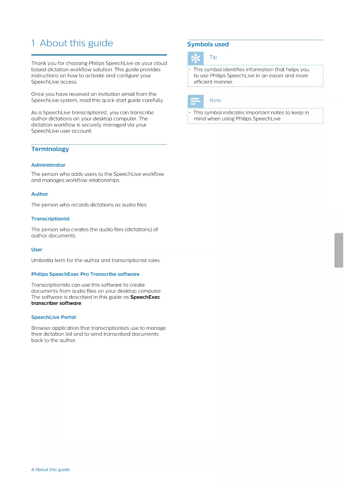 EN Quick start guide for transcriptionists 3 DE Kurzanleitung für Transkriptionisten 11 NL Snelstartgids voor transcribeerders 19 FR Guide de démarrage rapide transcripteurs 27 PCL1000 PCL1100 PCL111023 Table of contents 1 About this guide 4 Terminology 4 Administrator 4 Symbols used 4 2 Installing the application 5 3 Activating the SpeechLive user account 5 4 Conguring the application 6 Automatic conguration 6 Manual conguration (optional) 6 5 Transcribing dictations 7 SpeechExec transcription software 7 SpeechLive Portal 7 6 Additional information 8 Table of contents4 About this guide 1 About this guide Thank you for choosing Philips SpeechLive as your cloud based dictation workow solution. This guide provides instructions on how to activate and congure your SpeechLive access. Once you have received an invitation email from the SpeechLive system, read this quick start guide carefully. As a SpeechLive transcriptionist, you can transcribe author dictations on your desktop computer. The dictation workow is securely managed via your SpeechLive user account. Terminology Administrator The person who adds users to the SpeechLive workow and manages workow relationships. Author The person who records dictations as audio les. Transcriptionist The person who creates the audio les (dictations) of author documents. User Umbrella term for the author and transcriptionist roles. Philips SpeechExec Pro Transcribe software Transcriptionists can use this software to create documents from audio les on your desktop computer. The software is described in this guide as SpeechExec transcriber software. SpeechLive Portal Browser application that transcriptionists use to manage their dictation list and to send transcribed documents back to the author. Symbols used Tip