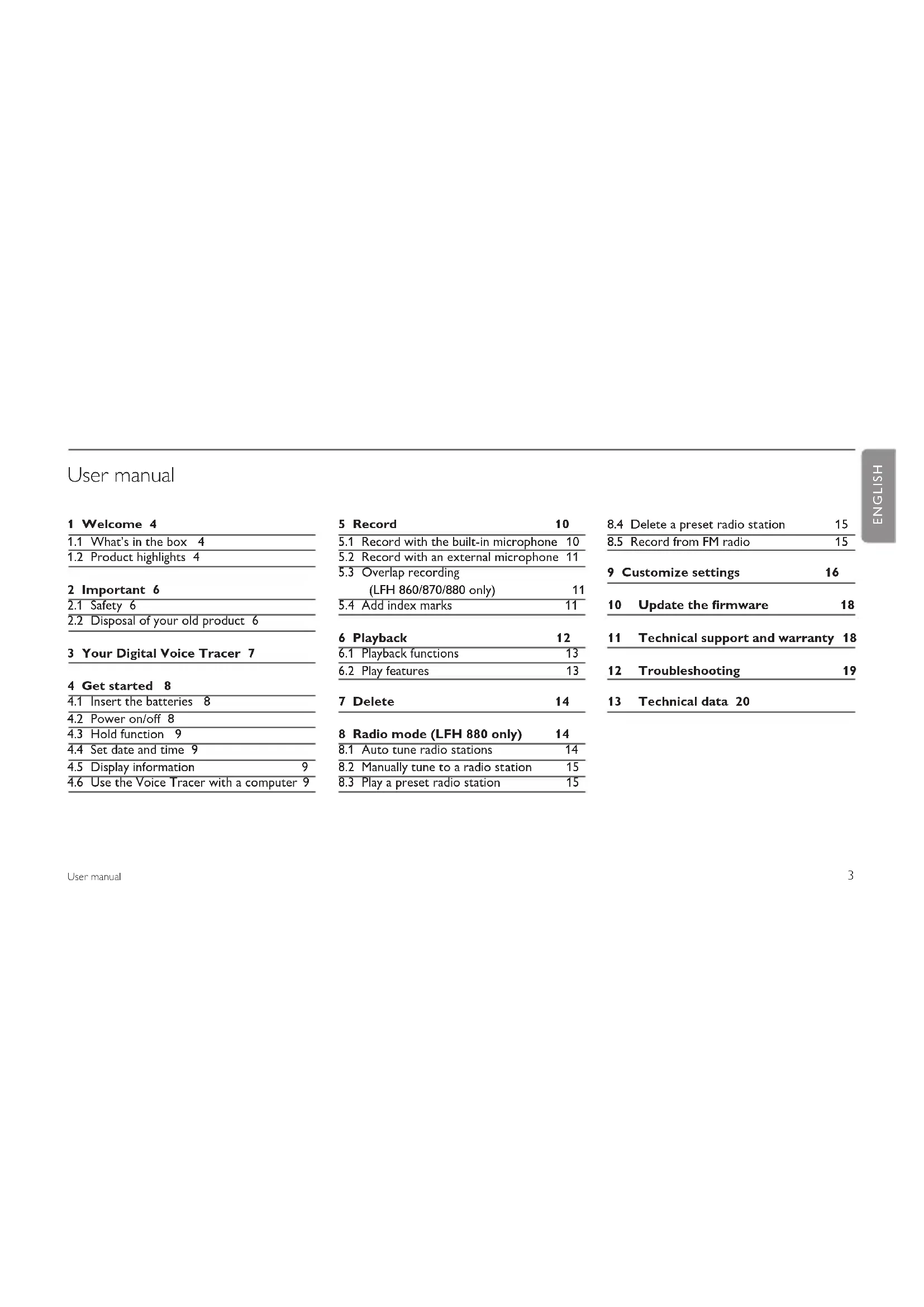 9 Customize settings 16 10 Update the firmware 18 11 Technical support and warranty 18 12 Troubleshooting 19 13 Technical data 20 ENGLISH4 User manual Welcome1 Congratulations on your purchase and welcome to Philips! To fully benefit from the support that Philips oers, visit our Website for support information such as user manuals, software downloads, warranty information and more: www.philips.com/dictation. What’s in the box 1.1 Product highlights1.2 Recording Records in popular MP3 format.• Choose between six recording modes. Uncompressed PCM stereo • recording* for audio CD-like quality, two stereo modes including SHQ and HQ, or three monaural modes including SP, LP and SLP for extended recording times. An adjustable recording sensitivity avoids background noises and • adjusts to the recording environment. Ample internal memory oers a large recording capacity and allows • the recording and storage of long recordings. The• voice-activated recording mode provides hands-free recording without having to worry about remembering to push the record button. The auto divide feature automatically divides long recordings into • separate files. This makes it much easier to find, edit and archive long recordings such as meetings or lectures. Record while powered through USB without draining the battery.*• Records from external audio sources via line-in.*• The large signal-to-noise (s/n) ratio of the microphone picks up every • detail of the human voice to give superb sound reproduction. User manual Batteries Stereo headphones * USB cable Lapel microphoneVoice Tracer Strap *5 User manual Playback Adjustable playback speed to play recordings in fast and slow playback • modes. Set a complete or a portion of an audio file to play repeatly with the • repeat playback option. Enjoy MP3 and WMA music plus FM radio *.• Alarm clock with voice playback and timer recording.• Convenience Large backlit screen for comfortable viewing.• Enjoy up to 22 hours of continuous operation.• Speedily transfer recordings, music and data via high-speed USB 2.0.• Index mark and temp mark features allow you to quickly find desired • locations in a recording. Supports up to 99 recordings in each of four available folders to • organize your files in a fast and easy way. As a USB mass storage device, the Voice Tracer oers a convenient • way to save, back up and move files without special software or driver installations.