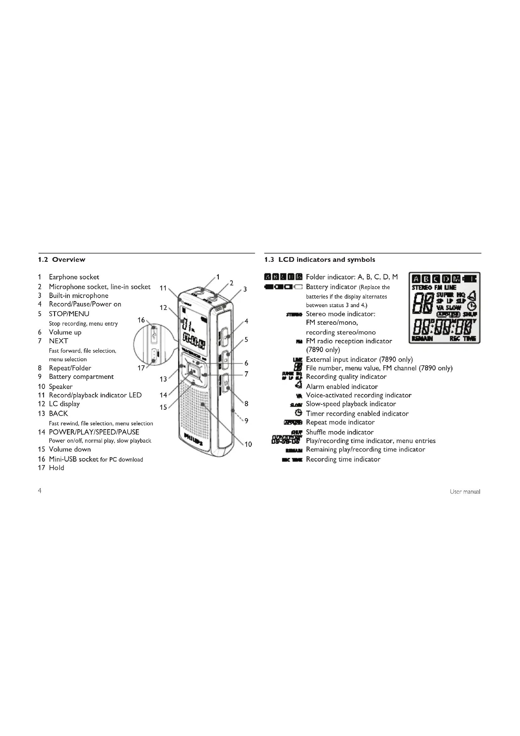 Folder indicator: A, B, C, D, M Battery indicator (Replace the batteries if the display alternates between status 3 and 4.) Stereo mode indicator: FM stereo/mono, recording stereo/mono FM radio reception indicator (7890 only) External input indicator (7890 only) File number, menu value, FM channel (7890 only) Recording quality indicator Alarm enabled indicator Voice-activated recording indicator Slow-speed playback indicator Timer recording enabled indicator Repeat mode indicator Shue mode indicator Play/recording time indicator, menu entries Remaining play/recording time indicator Recording time indicator5User manual