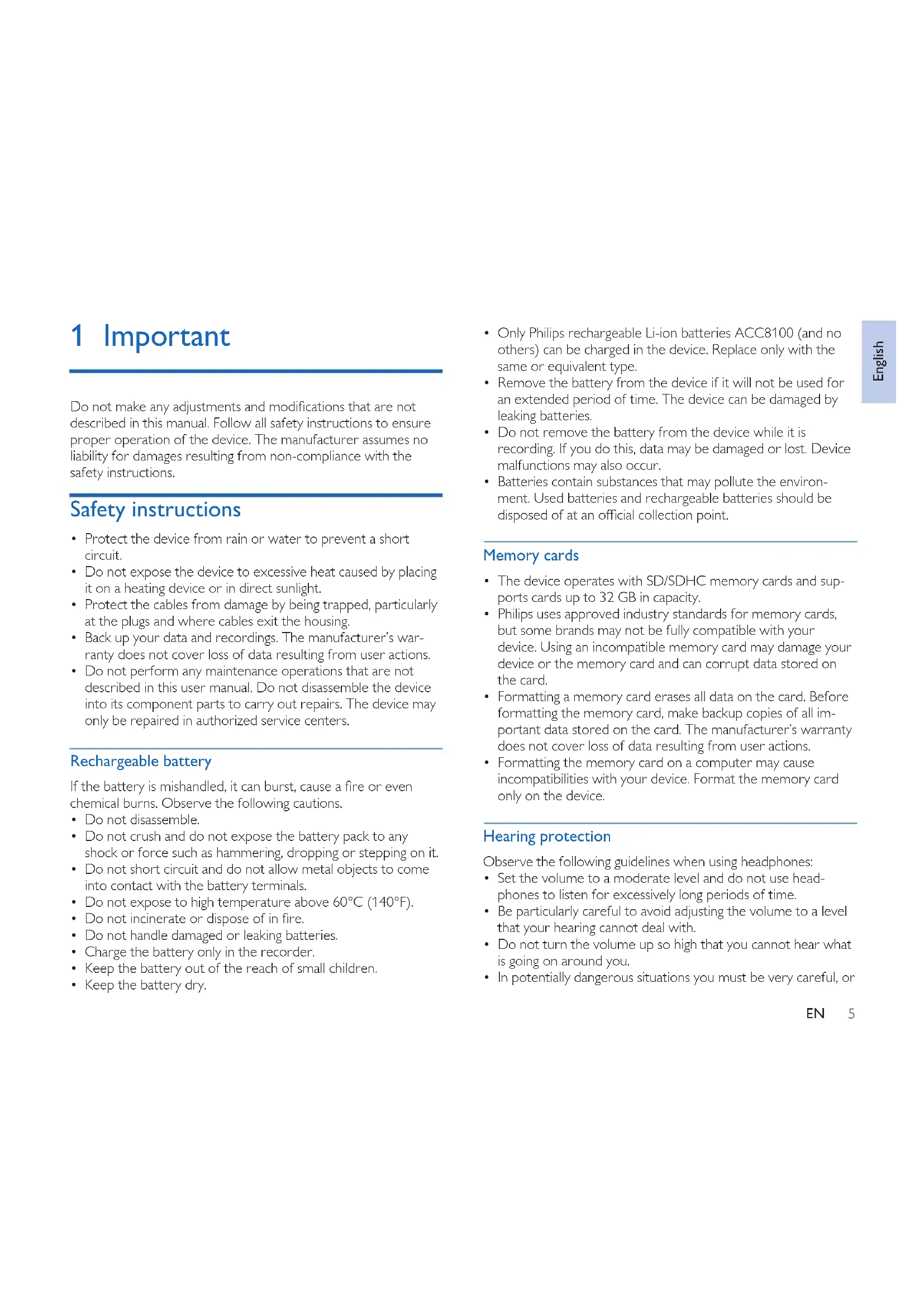 - Only Philips rechargeable Li-ion batteries ACC8100 (and no others) can be charged in the device. Replace only with the same or equivalent type.