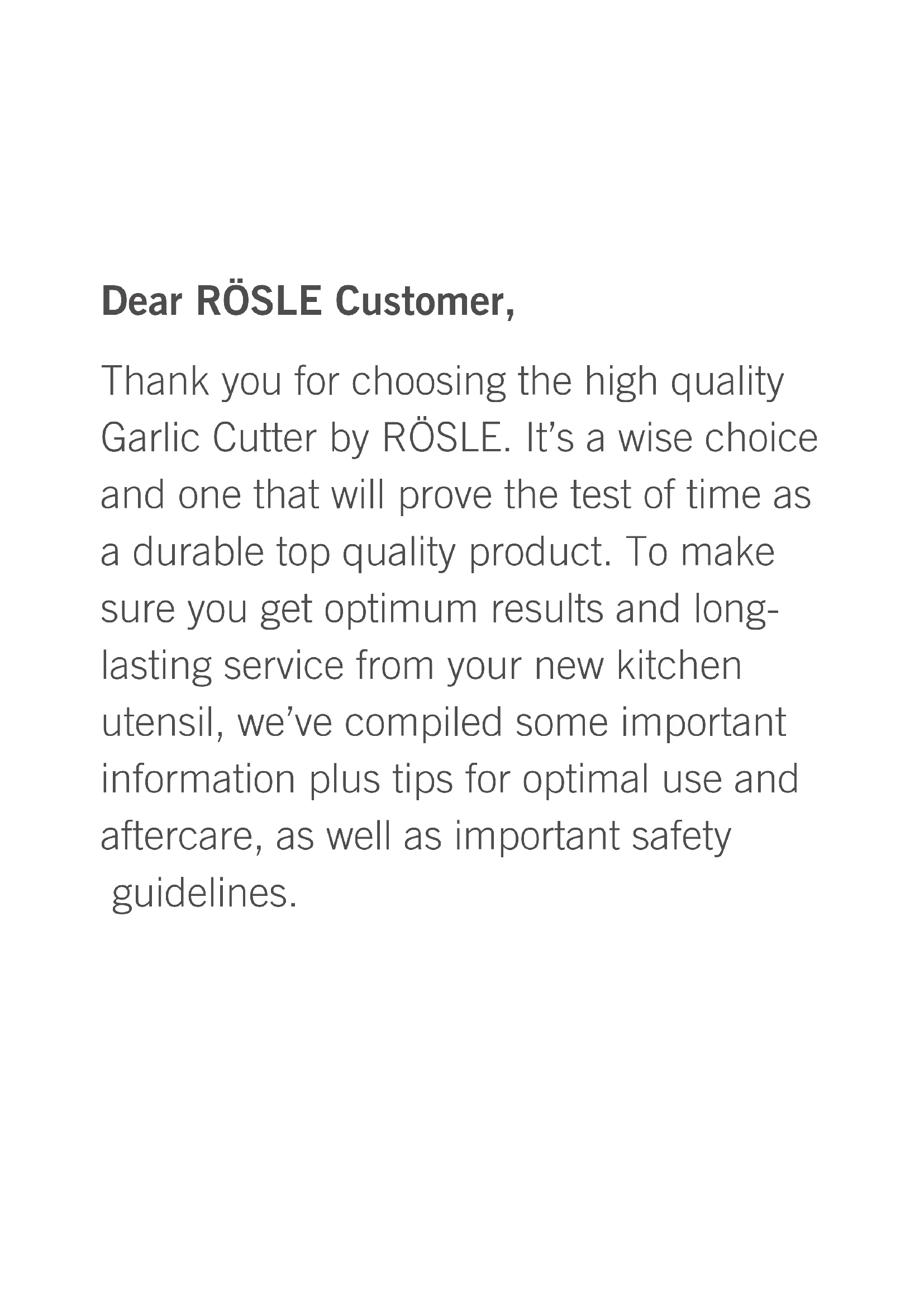 We wish you long lasting service from your new RÖSLE Kitchen Utensil.