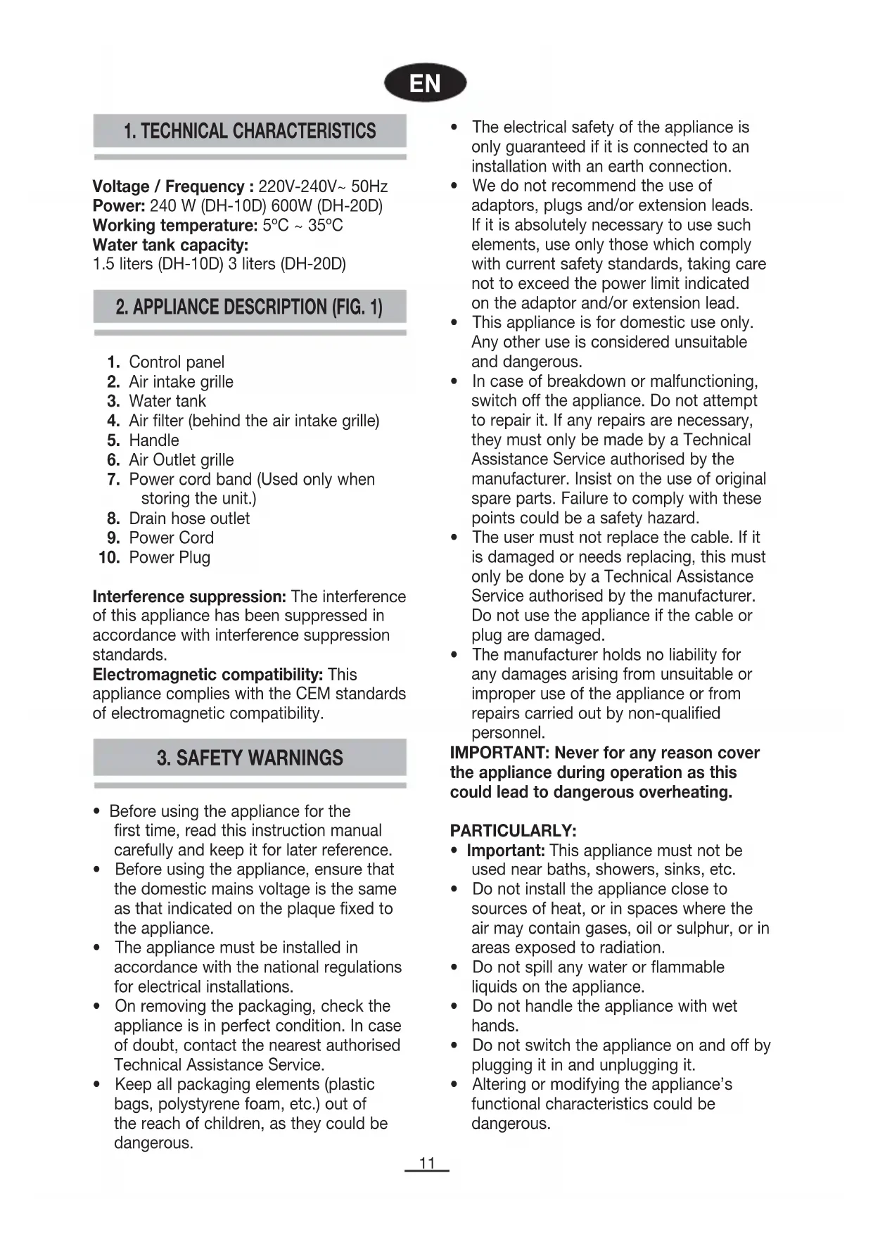Interference suppression: The interference of this appliance has been suppressed in accordance with interference suppression standards. Electromagnetic compatibility: This appliance complies with the CEM standards of electromagnetic compatibility. Voltage / Frequency : 220V-240V~ 50Hz Power: 240 W (DH-10D) 600W (DH-20D) Working temperature: 5ºC ~ 35ºC Water tank capacity:
