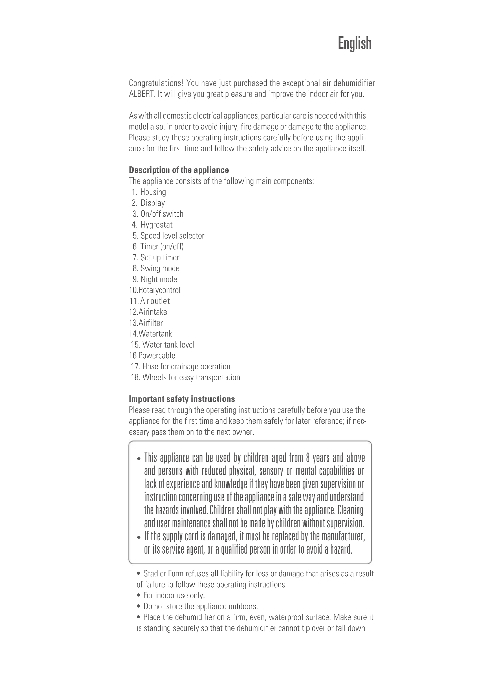 Download the instructions for your Dehumidifier in PDF format for free! Find your manual Albert - STADLERFORM and take your electronic device back in hand. On this page are published all the documents necessary for the use of your device. Albert by STADLERFORM.