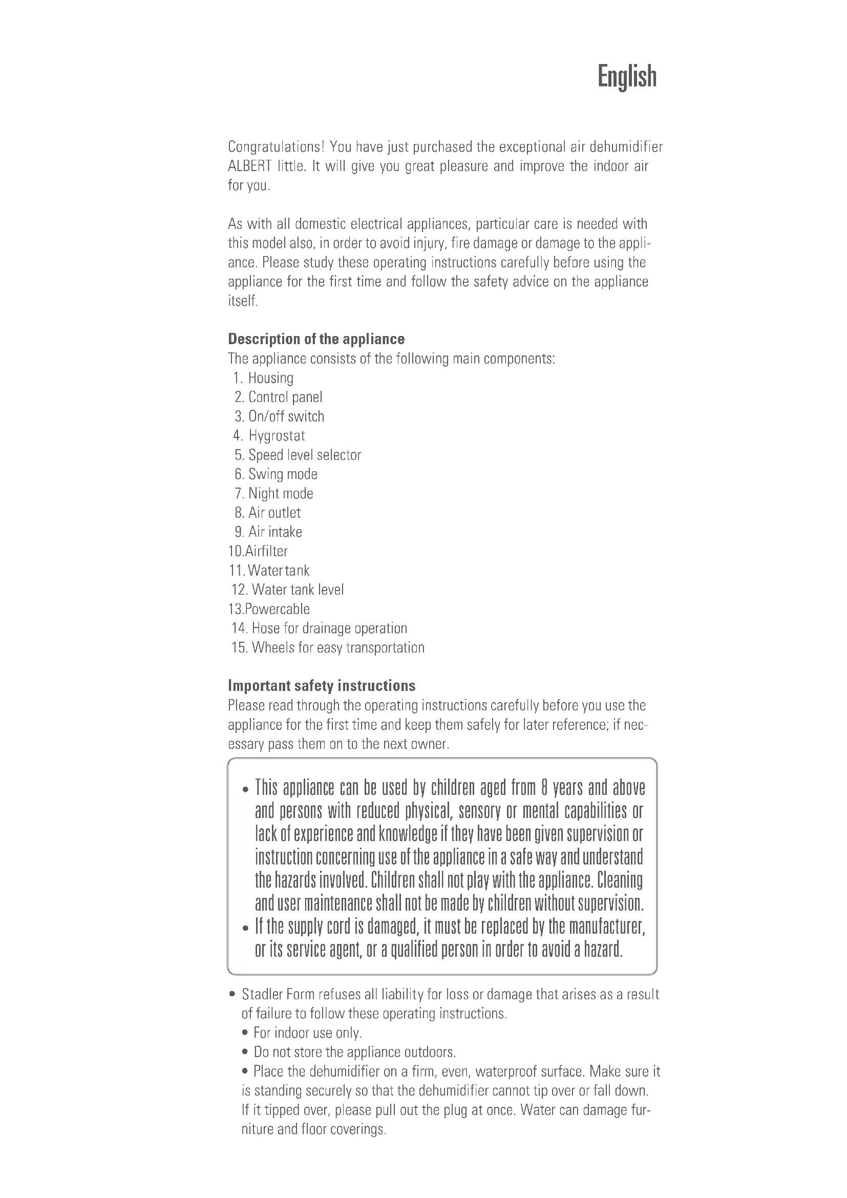Albert little - Dehumidifier STADLERFORM - Free user manual and instructions
