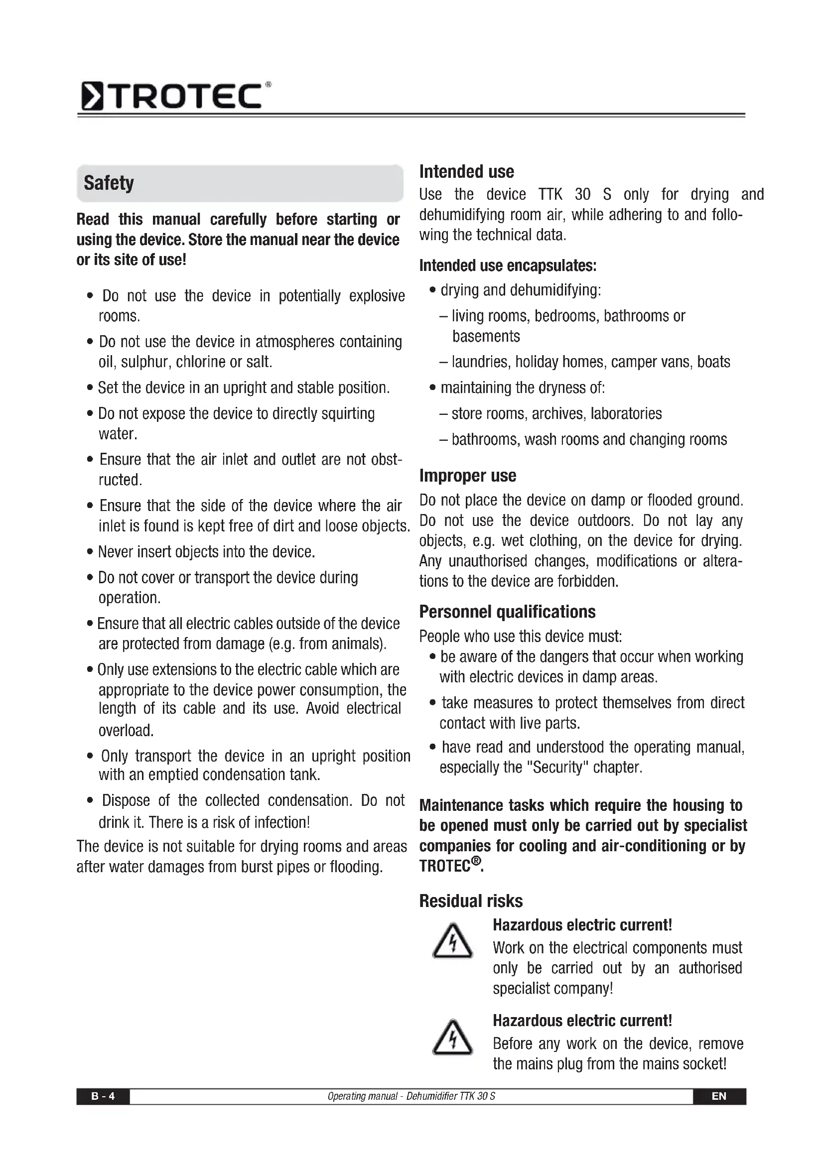 IEC 62233:2005 Hersteller: Trotec GmbH & Co. KG Telefon: +49 2452 962-400 Grebbener Straße 7 Fax: +49 2452 962-200 D-52525 Heinsberg E-Mail: info@trotec.de Heinsberg, den 19.04.2012 Geschäftsführer: Detlef von der Lieck Entsorgung KonformitätserklärungEN Operating manual - Dehumidifier TTK 30 S B - 1 Notes regarding the operation Manual ............ B - 01 Information about the device .......................... B - 02 Safety............................................................. B - 04 Transport......................................................... B - 05 Operation ........................................................B - 05 Errors and faults..............................................B - 08 Maintenance................................................... B - 09 Disposal ......................................................... B - 13 Declaration of conformity................................. B - 13 Symbols Hazardous electric current! Warns about hazards from electric cur- rent which can lead to injuries or even death. Danger! Warns of a hazard which can lead to per- sonal injury. Caution! Warns of a hazard which can lead to damage to property. Legal notice This release replaces all previous releases. No part of this publication may be reproduced without written permission. The same applies for electronically pro- cessing, duplicating or spreading the publication. Subject to technical changes. All rights reserved. Trademarks are used without guarantee that they may be used freely and primarily following the spelling of the manufacturer. The product names used are regis- tered and should be treated appropriately. The deli- vered product may vary from product images. This document was produced with all due care. We accept no liability whatsoever for mistakes or omissions. ©TROTEC