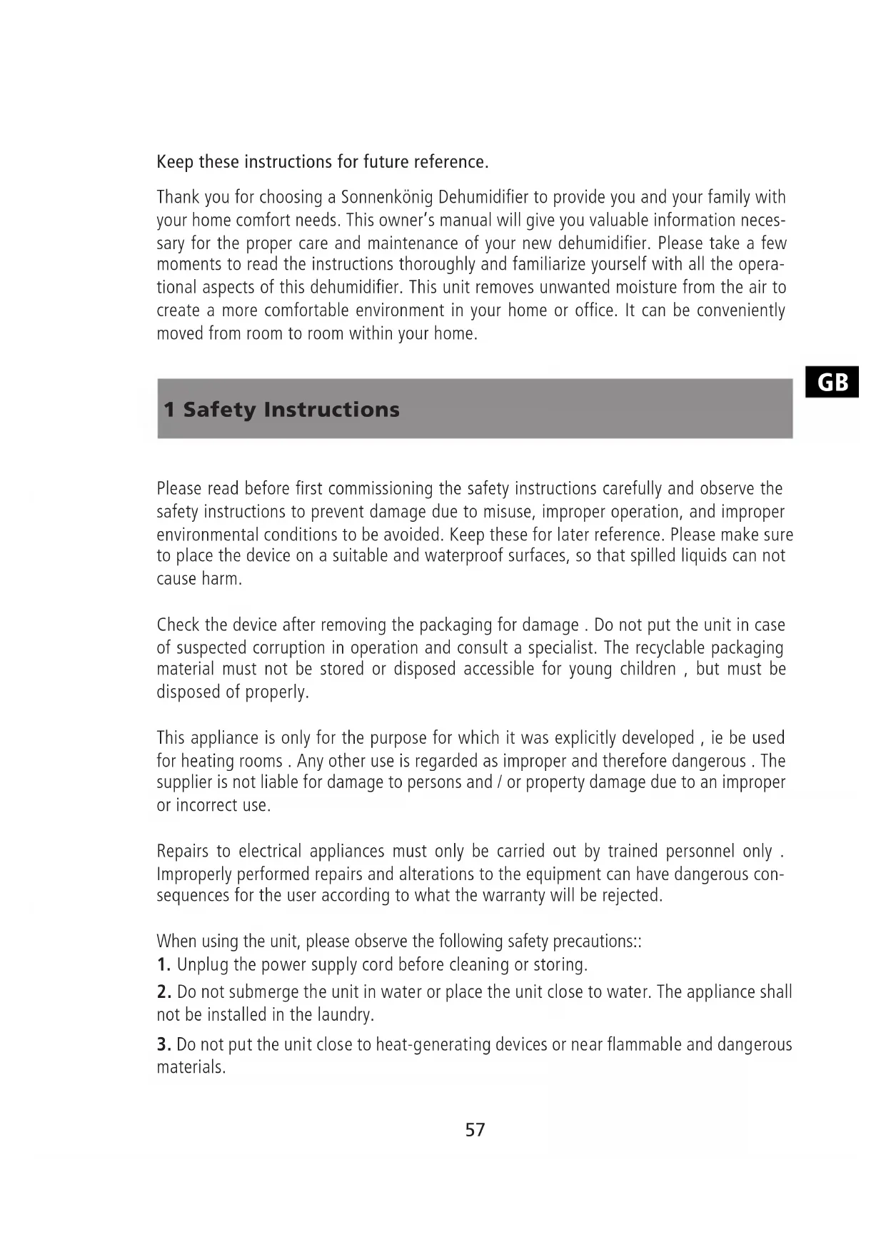 Thank you for choosing a Sonnenkönig Dehumidifier to provide you and your family with your home comfort needs. This owner's manual will give you valuable information necessary for the proper care and maintenance of your new dehumidifier. Please take a few moments to read the instructions thoroughly and familiarize yourself with all the operational aspects of this dehumidifier. This unit removes unwanted moisture from the air to create a more comfortable environment in your home or office. It can be conveniently moved from room to room within your home.