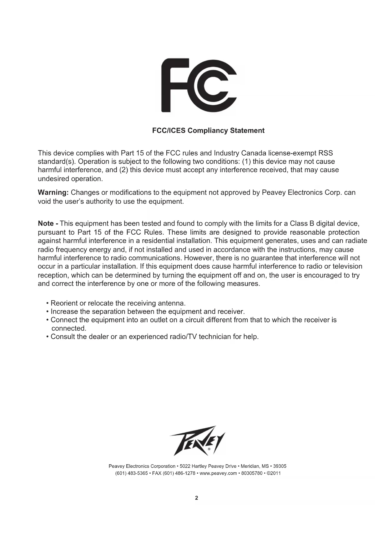 Warning: Changes or modications to the equipment not approved by Peavey Electronics Corp. can