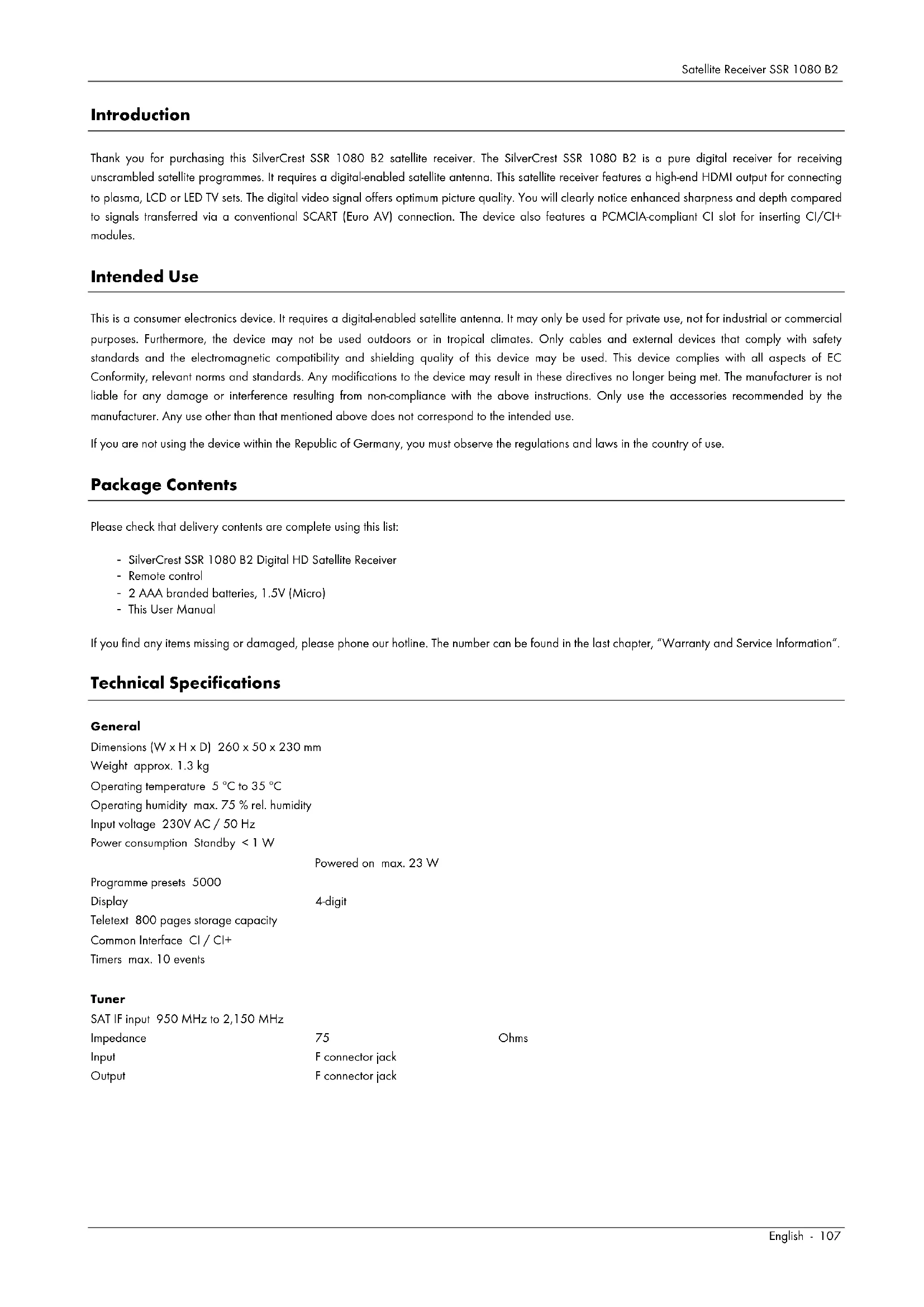 This item incorporates copy protection technology that is protected by U.S. patents and other intellectual property rights of Rovi Corporation. Reverse engineering and disassembly are prohibited.Satellite Receiver SSR 1080 B2 English - 107 Introduction Thank you for purchasing this SilverCrest SSR 1080 B2 satellite receiver. The SilverCrest SSR 1080 B2 is a pure digital receiver for receiving unscrambled satellite programmes. It requires a digital-enabled satellite antenna. This satellite receiver features a high-end HDMI output for connecting to plasma, LCD or LED TV sets. The digital video signal offers optimum picture quality. You will clearly notice enhanced sharpness and depth compared to signals transferred via a conventional SCART (Euro AV) connection. The device also features a PCMCIA-compliant CI slot for inserting CI/CI+ modules. Intended Use This is a consumer electronics device. It requires a digital-enabled satellite antenna. It may only be used for private use, not for industrial or commercial purposes. Furthermore, the device may not be used outdoors or in tropical climates. Only cables and external devices that comply with safety standards and the electromagnetic compatibility and shielding quality of this device may be used. This device complies with all aspects of EC Conformity, relevant norms and standards. Any modifications to the device may result in these directives no longer being met. The manufacturer is not liable for any damage or interference resulting from non-compliance with the above instructions. Only use the accessories recommended by the manufacturer. Any use other than that mentioned above does not correspond to the intended use. If you are not using the device within the Republic of Germany, you must observe the regulations and laws in the country of use. Package Contents Please check that delivery contents are complete using this list: - SilverCrest SSR 1080 B2 Digital HD Satellite Receiver - Remote control - 2 AAA branded batteries, 1.5V (Micro) - This User Manual If you find any items missing or damaged, please phone our hotline. The number can be found in the last chapter, “Warranty and Service Information“. Technical Specifications General Dimensions (W x H x D) 260 x 50 x 230 mm Weight approx. 1.3 kg Operating temperature 5 ºC to 35 ºC Operating humidity max. 75 % rel. humidity Input voltage 230V AC / 50 Hz Power consumption Standby < 1 W Powered on max. 23 W Programme presets 5000 Display 4-digit Teletext 800 pages storage capacity Common Interface CI / CI+ Timers max. 10 events