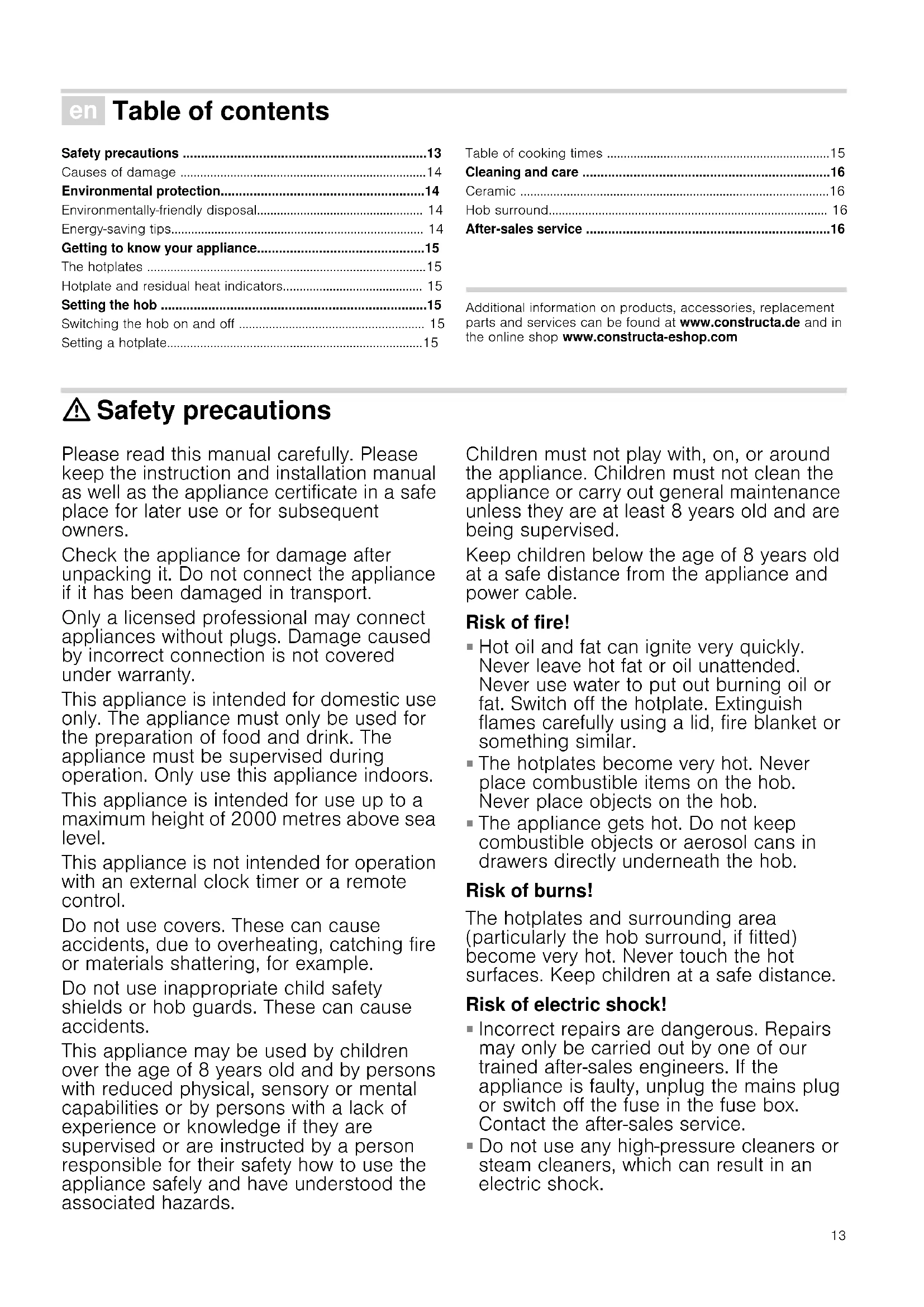 - Ongoing cooking without lid ** Without lid16 Cleaning and care The information in this section provides help on how best to care for your hob. Suitable maintenance and cleaning products can be purchased from the after-sales service or in our e-Shop. Ceramic Clean the hob after each use. This will prevent spills from burning onto the ceramic. Only clean the hob when it has cooled down sufficiently. Use only cleaning agents which are suitable for glass ceramic. Follow the cleaning instructions on the packaging. Never use: ■ Undiluted washing-up liquid ■ Detergent intended for dishwashers ■ Scouring agents ■ Harsh cleaning agents such as oven spray or stain remover ■ Abrasive sponges ■ High-pressure cleaners or steam jet cleaners Ground-in dirt can be best removed with a glass scraper, available from retailers. Please note the manufacturer's instructions. You can also obtain a suitable glass scraper from our after- sales service or from the e-Shop. Using special sponges to clean glass ceramic achieves great cleaning results. Hob surround To prevent damage to the hob surround, observe the following instructions: ■ Use only hot soapy water. ■ Wash new sponge cloths thoroughly before use. ■ Do not use any sharp or abrasive agents. ■ Do not use the glass scraper. After-sales service Our after-sales service is there for you if your appliance should need to be repaired. We are committed fo find the best solution also in order to avoid an unnecessary call-out. E number and FD number: Please quote the E number (product number) and the FD number (production number) of your appliance when contacting the after-sales service. The rating plate bearing these numbers can be found on the appliance certificate. Please note that a visit from an after-sales service engineer is not free of charge, even during the warranty period. Please find the contact data of all countries in the enclosed customer service list. Rely on the professionalism of the manufacturer. You can therefore be sure that the repair is carried out by trained service technicians who carry original spare parts for your appliances. Boiling, steaming, braising Rice (with double the quantity of water) Unpeeled boiled potatoes Boiled potatoes Pasta, noodles Stew, soups Vegetables and frozen vegetables Cooking in a pressure cooker