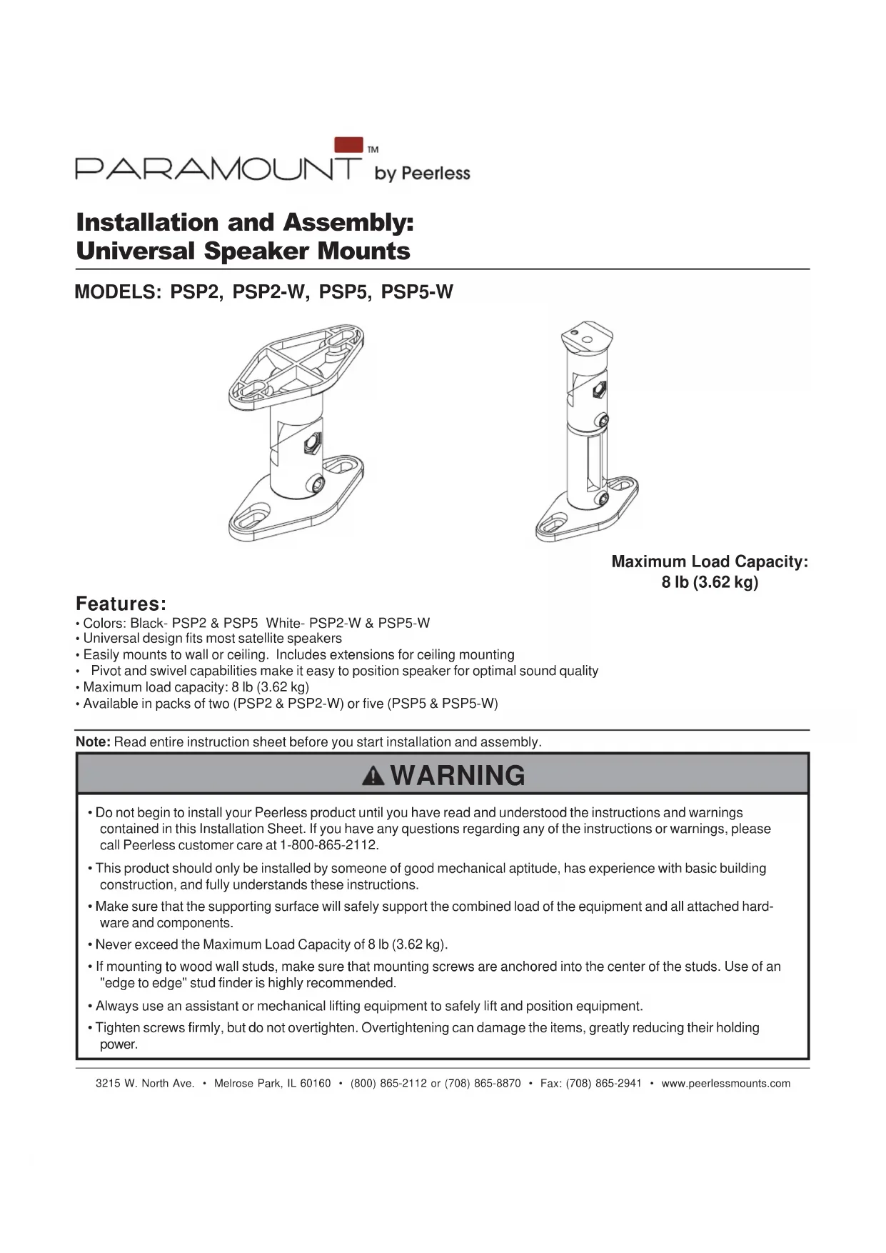 3215 W. North Ave. • Melrose Park, IL 60160 • (800) 865-2112 or (708) 865-8870 • Fax: (708) 865-2941 • www.peerlessmounts.com Installation and Assembly: Universal Speaker Mounts Features: