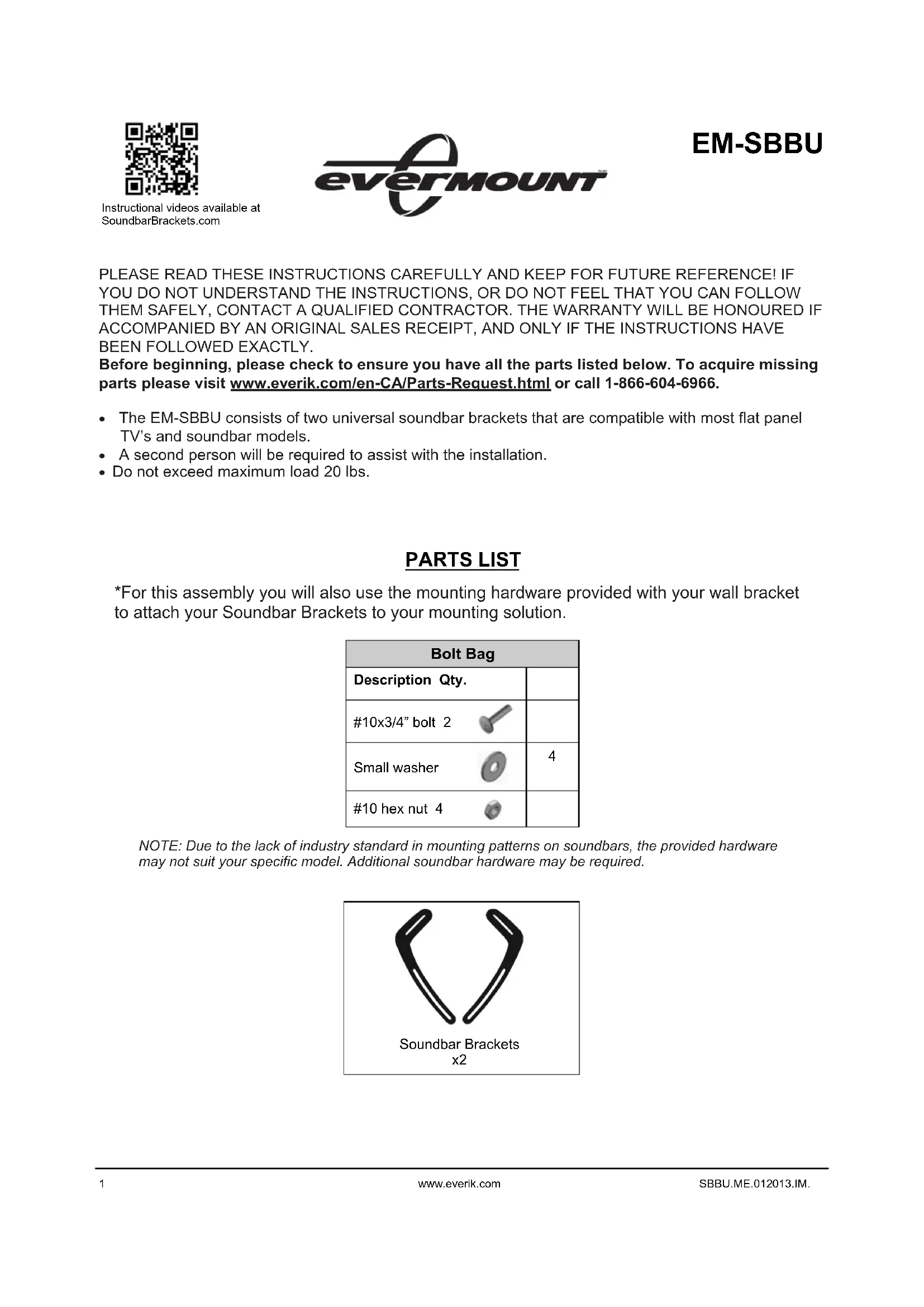 NOTE: Due to the lack of industry standard in mounting patterns on soundbars, the provided hardware may not suit your specific model. Additional soundbar hardware may be required.
