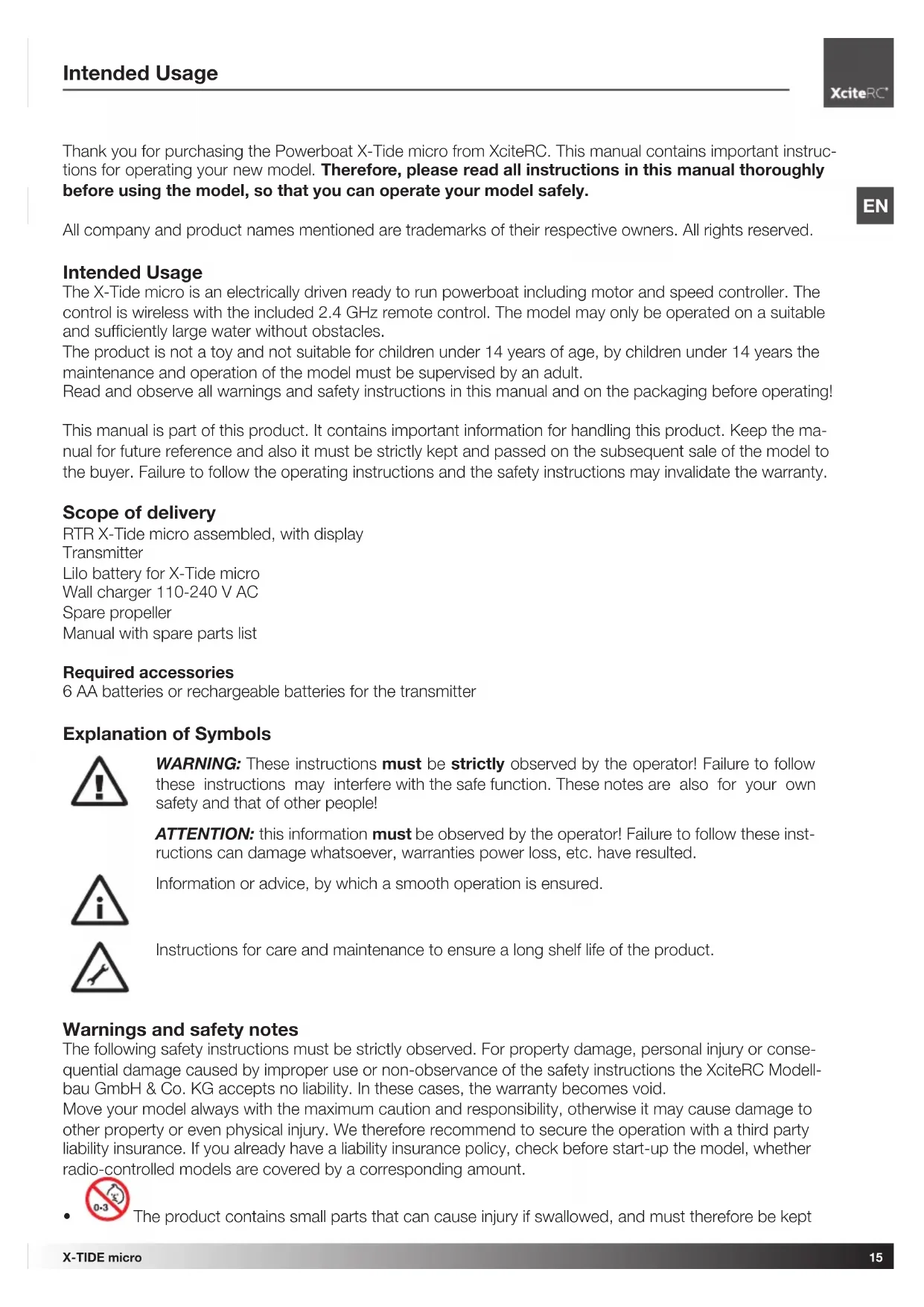 Thank you for purchasing the Powerboat X-Tide micro from XCiteRC. This manual contains important instructions for operating your new model. Therefore, please read all instructions in this manual thoroughly before using the model, so that you can operate your model safely.