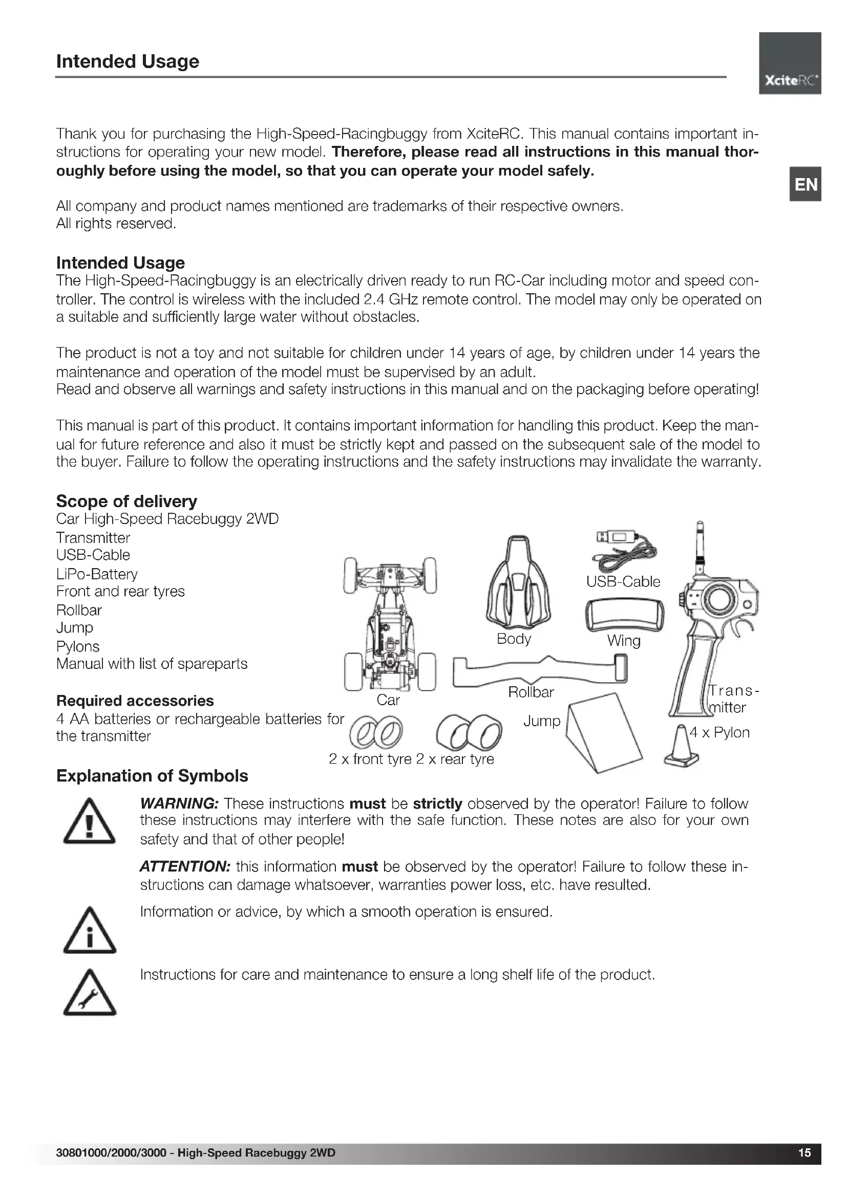Thank you for purchasing the High-Speed-Racingbuggy from XciteRC. This manual contains important instructions for operating your new model. Therefore, please read all instructions in this manual thoroughly before using the model, so that you can operate your model safely.