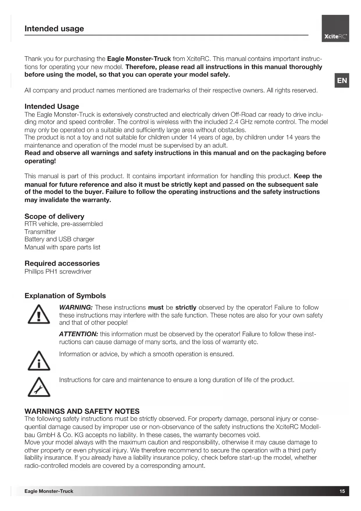 Thank you for purchasing the Eagle Monster-Truck from XciteRC. This manual contains important instructions for operating your new model. Therefore, please read all instructions in this manual thoroughly before using the model, so that you can operate your model safely.