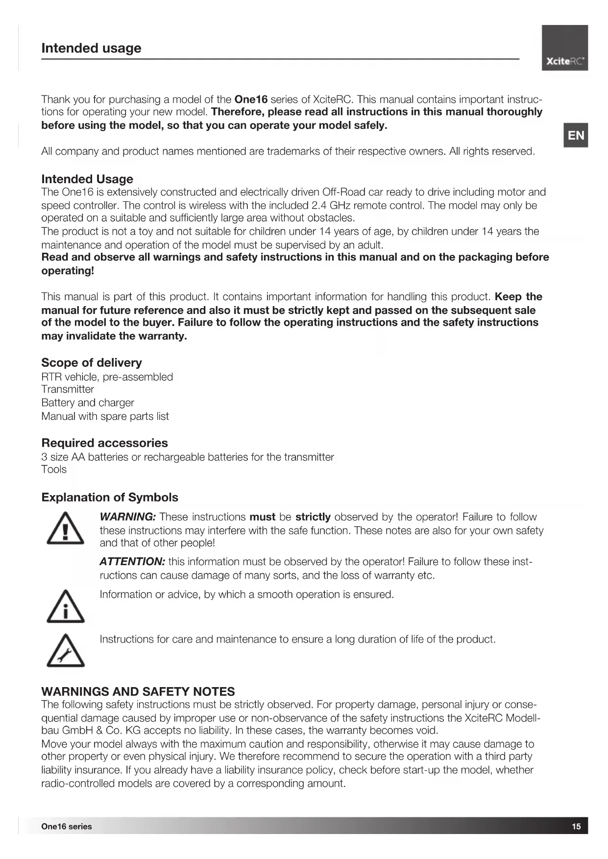 Thank you for purchasing a model of the One16 series of XciteRC. This manual contains important instructions for operating your new model. Therefore, please read all instructions in this manual thoroughly before using the model, so that you can operate your model safely.
