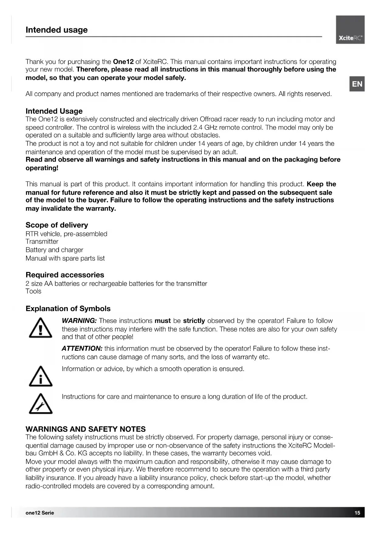 Thank you for purchasing the One12 of XciteRC. This manual contains important instructions for operating your new model. Therefore, please read all instructions in this manual thoroughly before using the model, so that you can operate your model safely.
