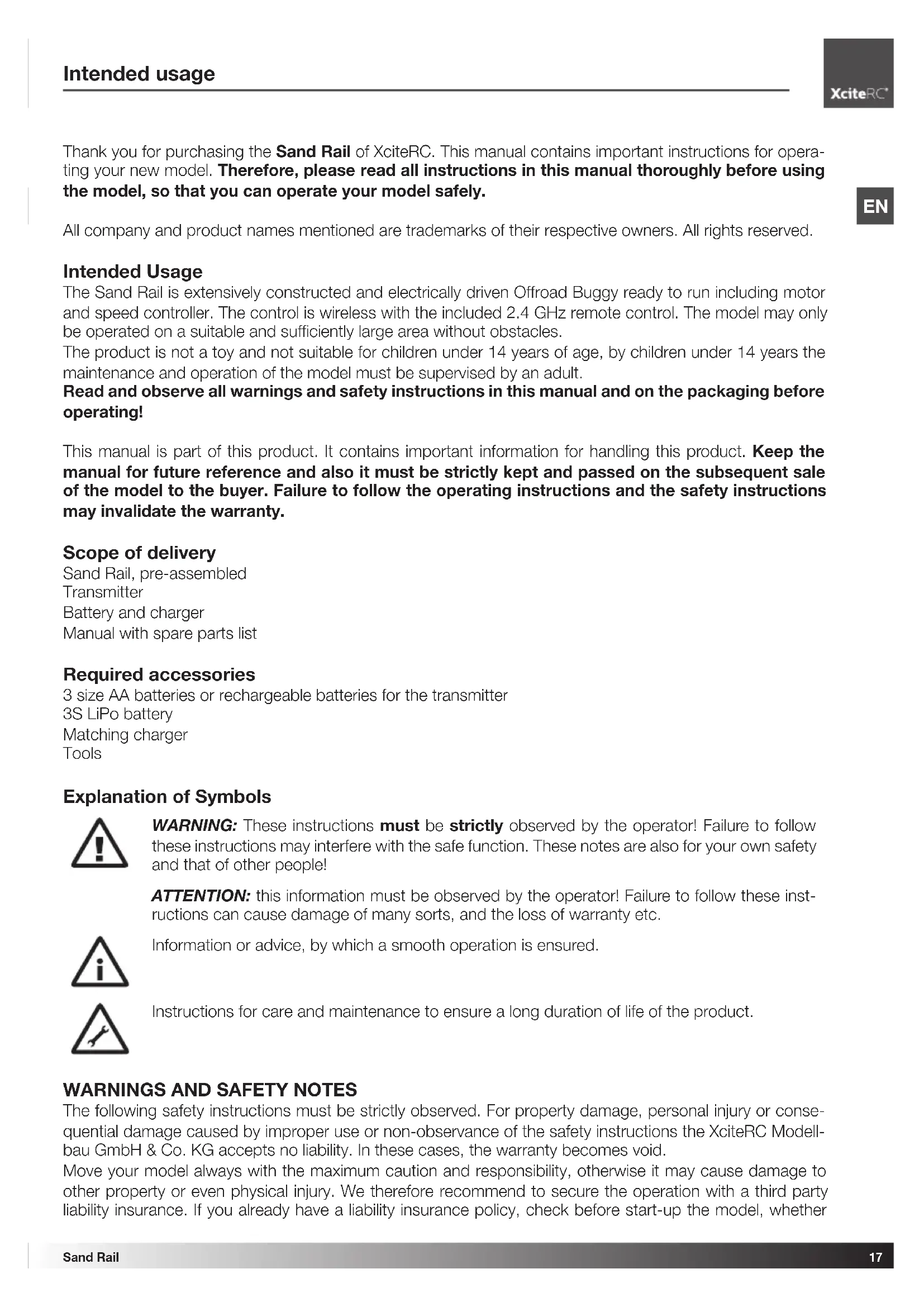 Intended usage Thank you for purchasing the Sand Rail of XciteRC. This manual contains important instructions for opera- ting your new model. Therefore, please read all instructions in this manual thoroughly before using the model, so that you can operate your model safely. All company and product names mentioned are trademarks of their respective owners. All rights reserved. Intended Usage The Sand Rail is extensively constructed and electrically driven Offroad Buggy ready to run including motor and speed controller. The control is wireless with the included 2.4 GHz remote control. The model may only be operated on a suitable and sufficiently large area without obstacles. The product is not a toy and not suitable for children under 14 years of age, by children under 14 years the maintenance and operation of the model must be supervised by an adult. Read and observe all warnings and safety instructions in this manual and on the packaging before operating! This manual is part of this product. It contains important information for handling this product. Keep the manual for future reference and also it must be strictly kept and passed on the subsequent sale of the model to the buyer. Failure to follow the operating instructions and the safety instructions may invalidate the warranty. Scope of delivery Sand Rail, pre-assembled Transmitter Battery and charger Manual with spare parts list Required accessories 3 size AA batteries or rechargeable batteries for the transmitter 3S LiPo battery Matching charger Tools Explanation of Symbols