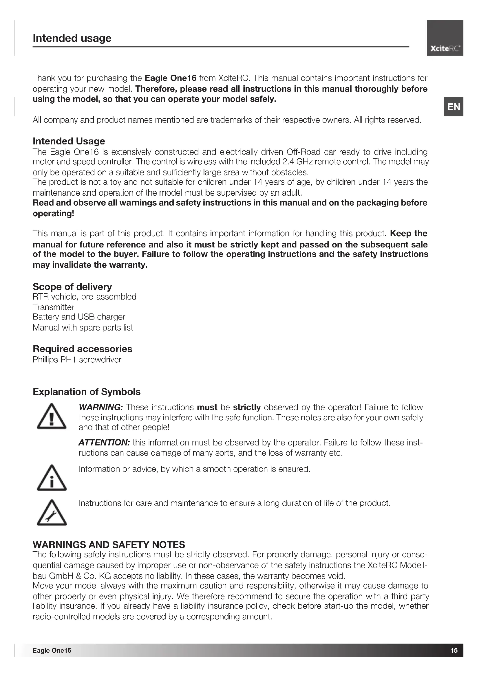Thank you for purchasing the Eagle One16 from XciteRC. This manual contains important instructions for operating your new model. Therefore, please read all instructions in this manual thoroughly before using the model, so that you can operate your model safely.