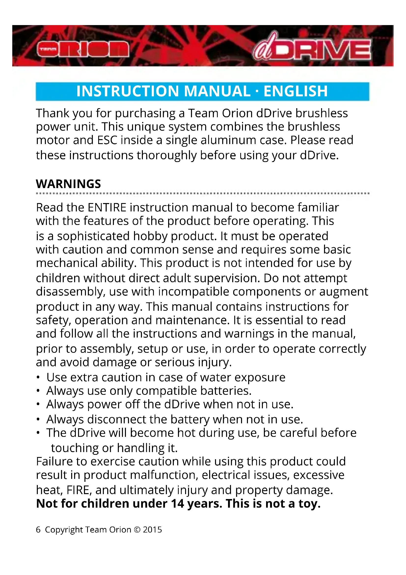Thank you for purchasing a Team Orion dDrive brushless power unit. This unique system combines the brushless motor and ESC inside a single aluminum case. Please read these instructions thoroughly before using your dDrive.