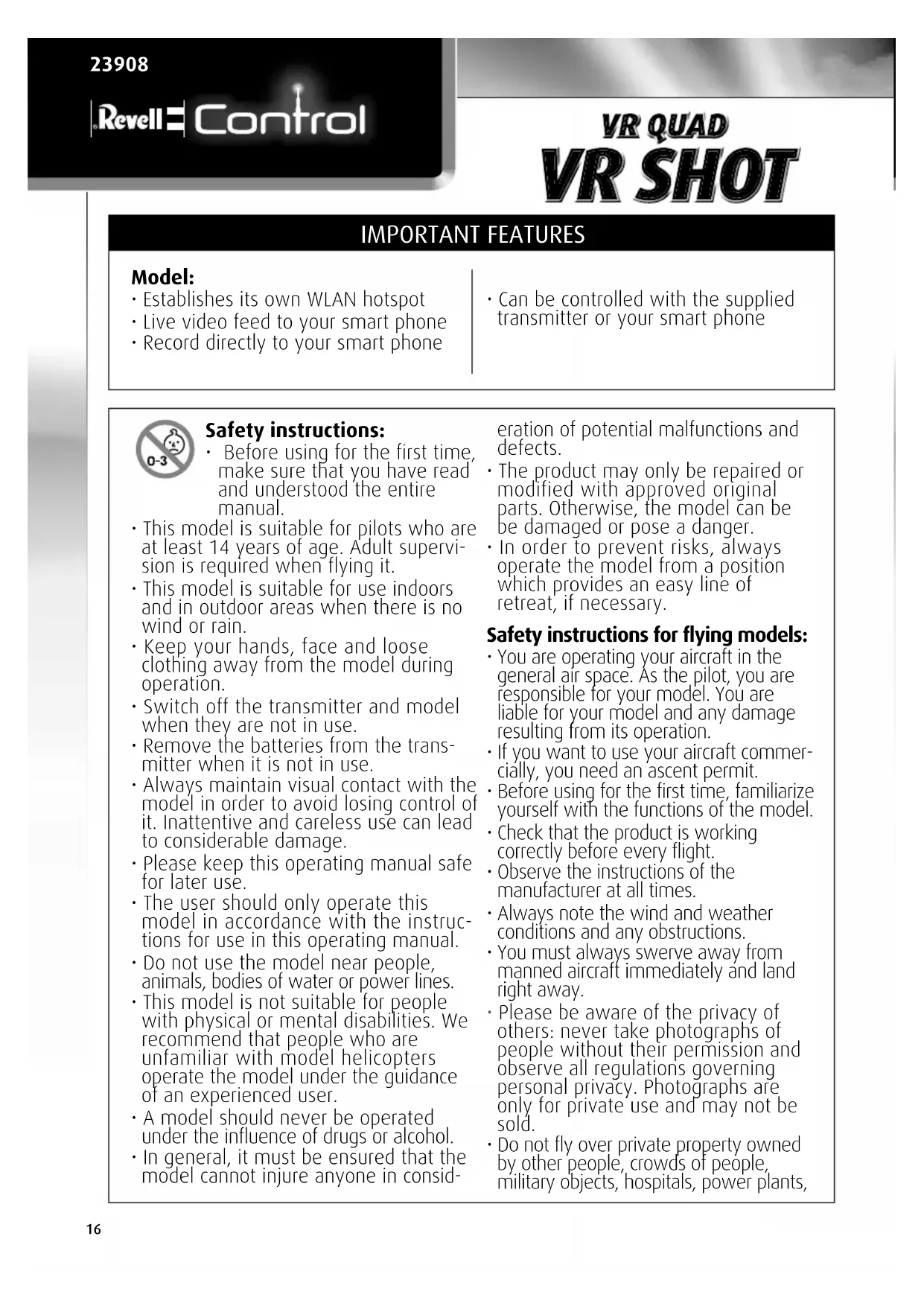 Download the instructions for your Remote control toy in PDF format for free! Find your manual VRSHOT - Revell and take your electronic device back in hand. On this page are published all the documents necessary for the use of your device. VRSHOT by Revell.