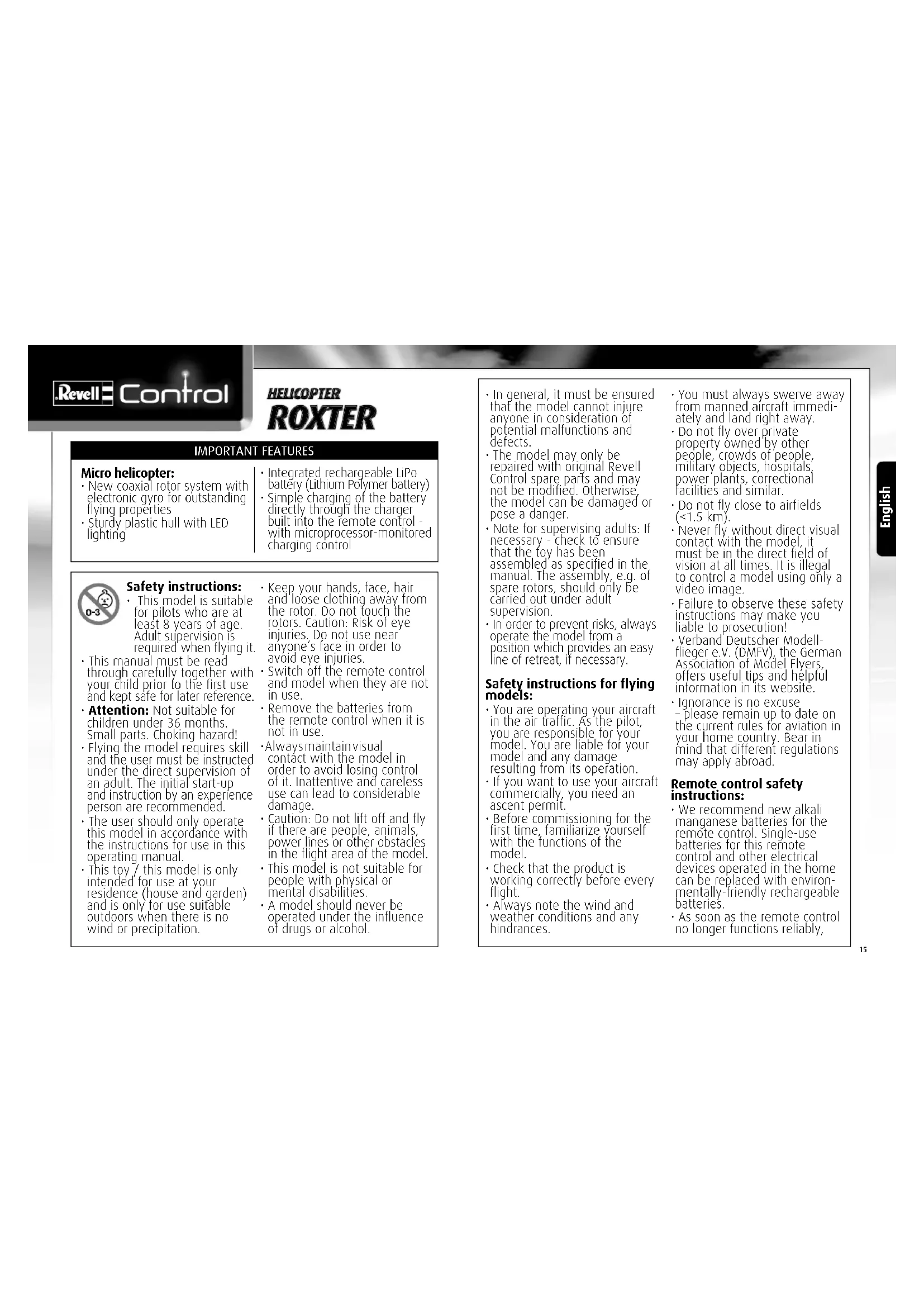 The model may only be repaired with original Revell Control spare parts and may not be modified. Otherwise the model can be damaged or pose a danger.