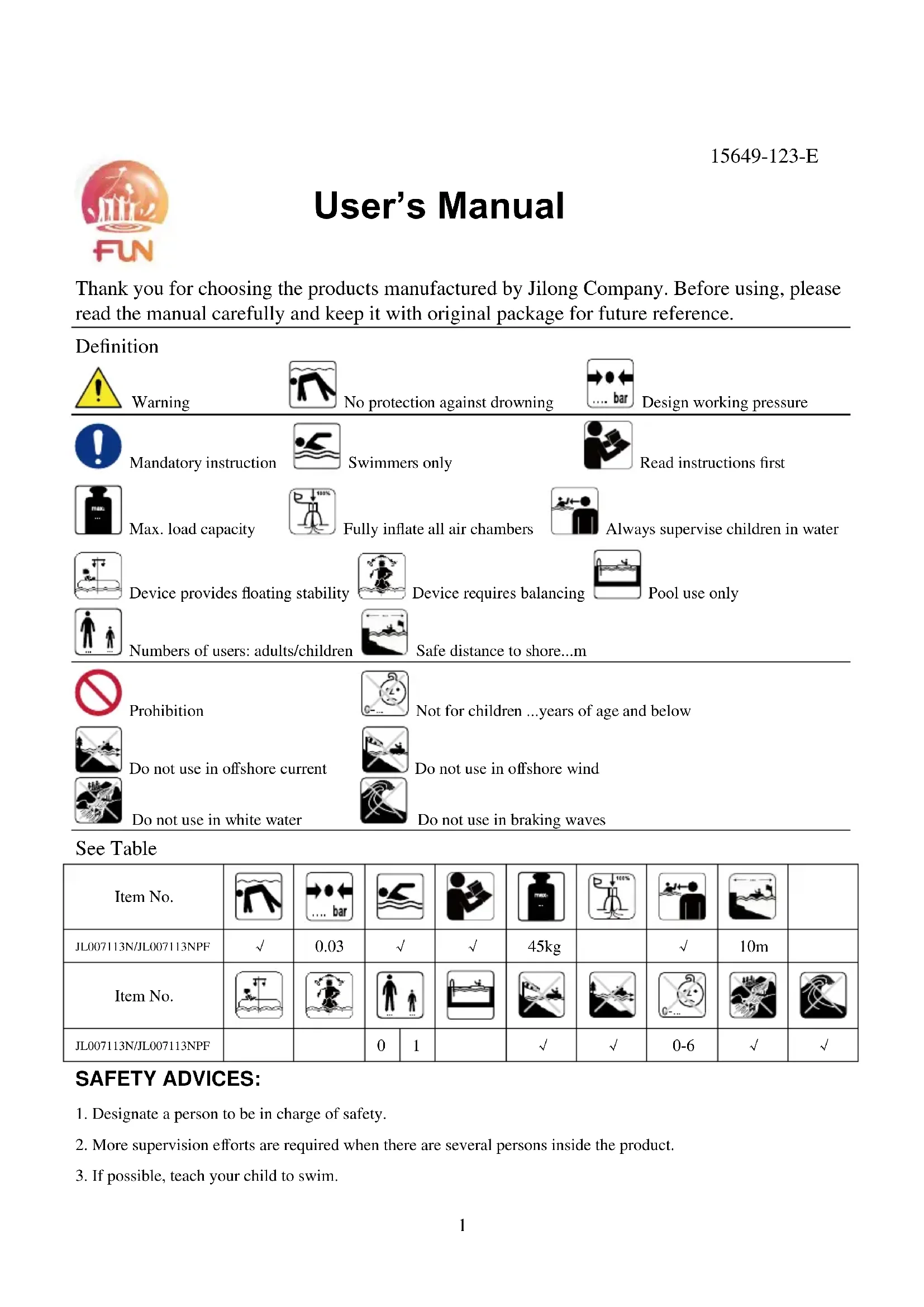 Thank you for choosing the products manufactured by Jilong Company. Before using, please read the manual carefully and keep it with original package for future reference. Definition Warning No protection against drowning Design working pressure Mandatory instruction Swimmers only Read instructions first Max. load capacity Fully inflate all air chambers Always supervise children in water Device provides floating stability Device requires balancing Pool use only Numbers of users: adults/children Safe distance to shore...m Prohibition Not for children ...years of age and below Do not use in offshore current Do not use in offshore wind Do not use in white water Do not use in braking waves See Table Item No.