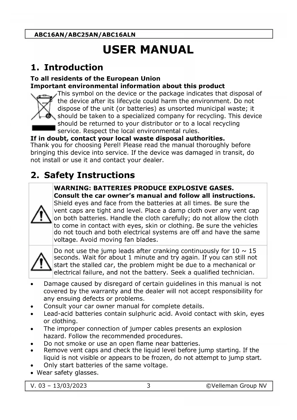Use this device with original accessories only. Velleman Group NV cannot be held responsible in the event of damage or injury resulting from (incorrect) use of this device. For more info concerning this product and the latest version of this manual, please visit our website www.perel.eu. The information in this manual is subject to change without prior notice. © COPYRIGHT NOTICE The copyright to this manual is owned by Velleman Group NV. All worldwide rights reserved. No part of this manual may be copied, reproduced, translated or reduced to any electronic medium or otherwise without the prior written consent of the copyright holder.ABC16AN/ABC25AN/ABC16ALN