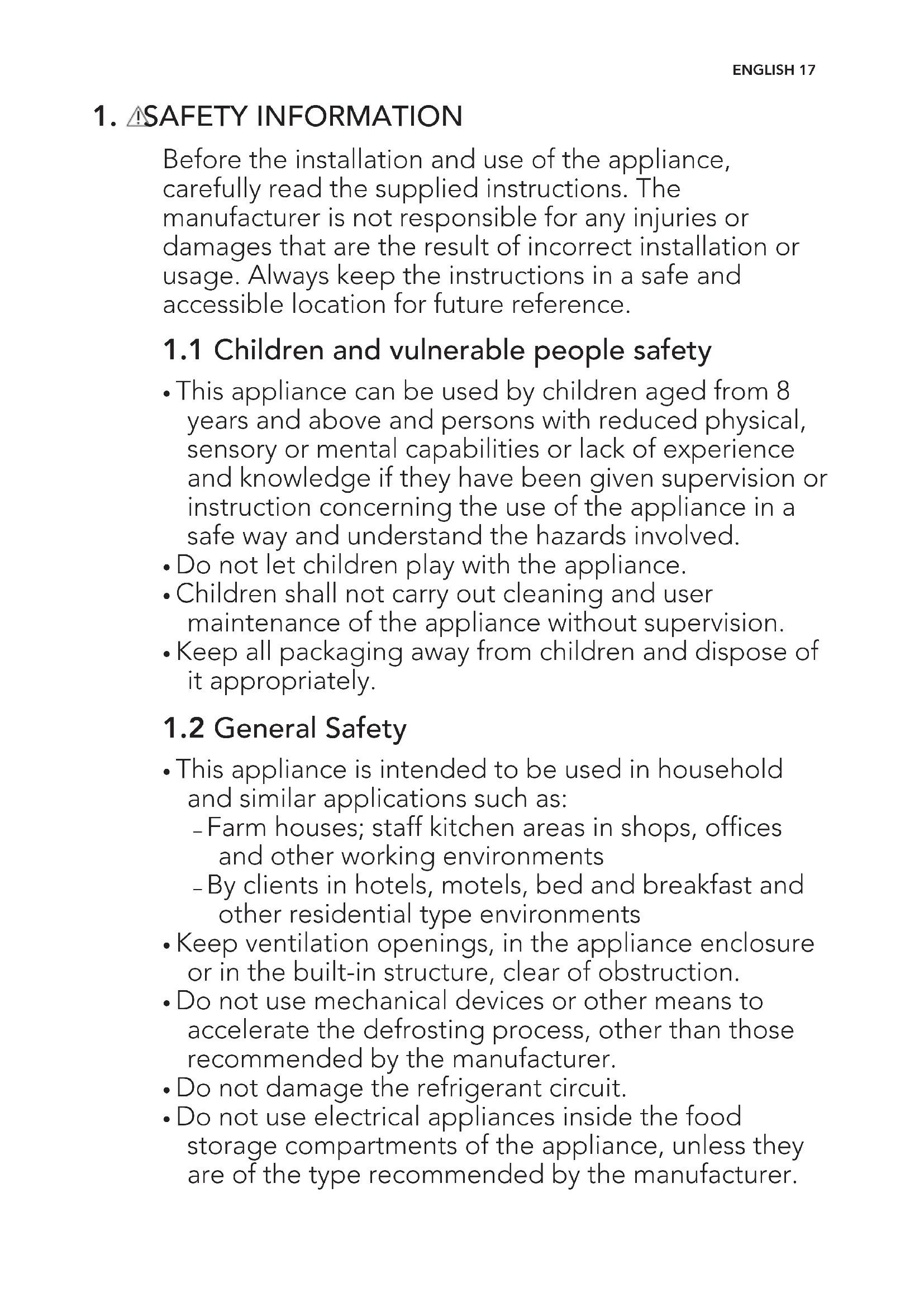 - Do not use electrical appliances inside the food storage compartments of the appliance, unless they are of the type recommended by the manufacturer. ENGLISH 17• Do not use water spray and steam to clean the appliance.