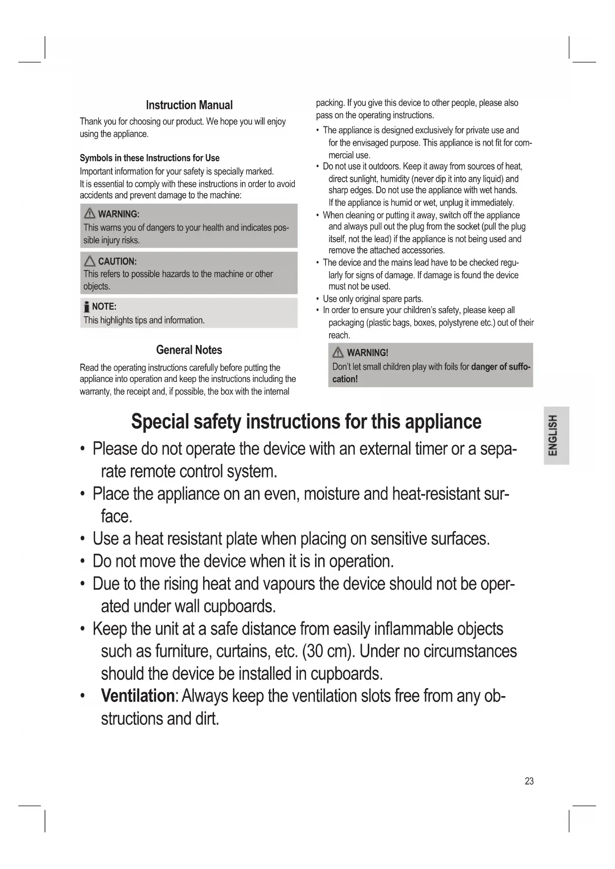 - In order to ensure your children’s safety, please keep all packaging (plastic bags, boxes, polystyrene etc.) out of their reach. WARNING! Don’t let small children play with foils for danger of suffo- cation! Special safety instructions for this appliance