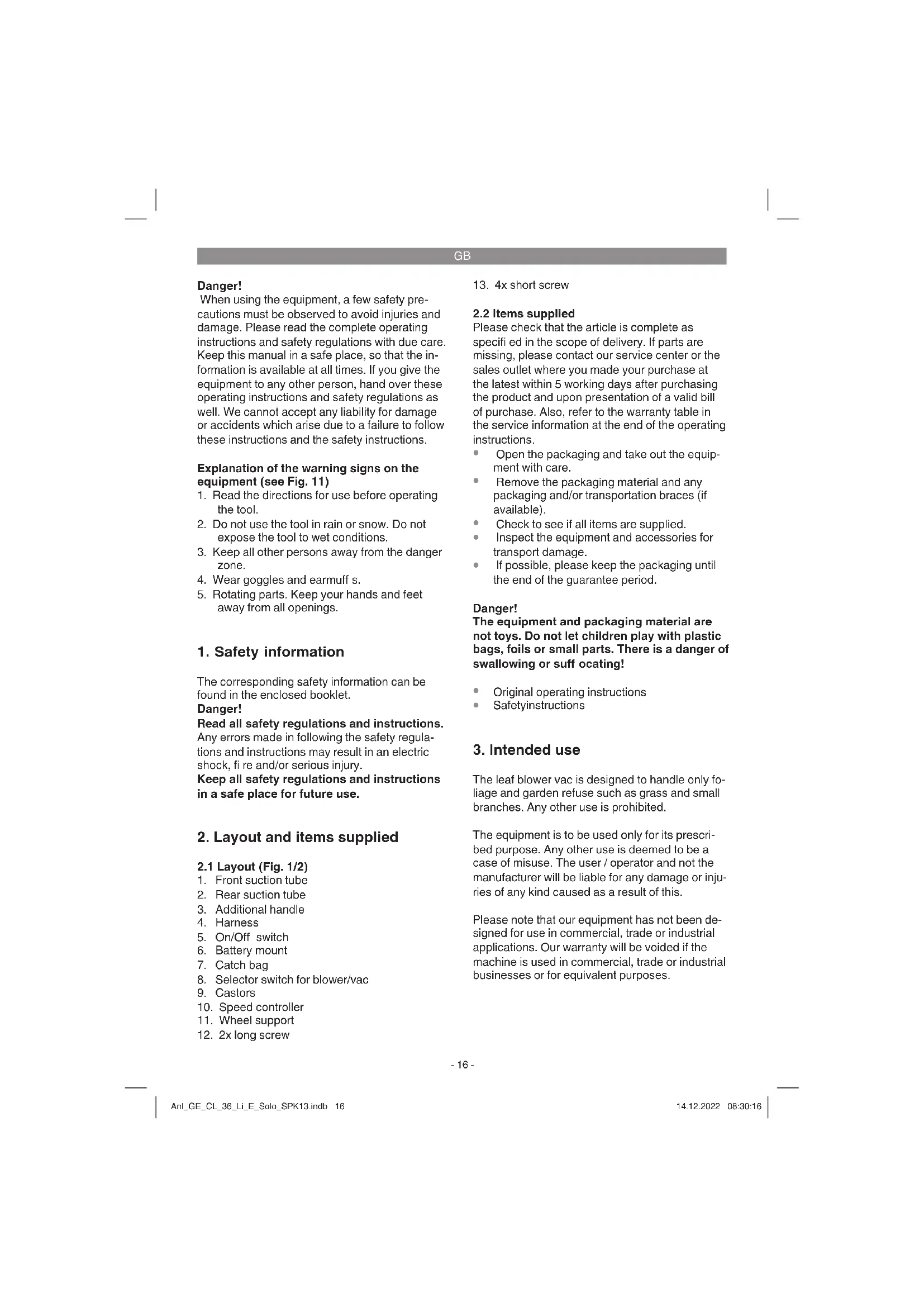 The leaf blower vac is designed to handle only fo- liage and garden refuse such as grass and small branches. Any other use is prohibited. The equipment is to be used only for its prescri- bed purpose. Any other use is deemed to be a case of misuse. The user / operator and not the manufacturer will be liable for any damage or inju- ries of any kind caused as a result of this. Please note that our equipment has not been de- signed for use in commercial, trade or industrial applications. Our warranty will be voided if the machine is used in commercial, trade or industrial businesses or for equivalent purposes. Anl_GE_CL_36_Li_E_Solo_SPK13.indb 16Anl_GE_CL_36_Li_E_Solo_SPK13.indb 16 14.12.2022 08:30:1614.12.2022 08:30:16GB