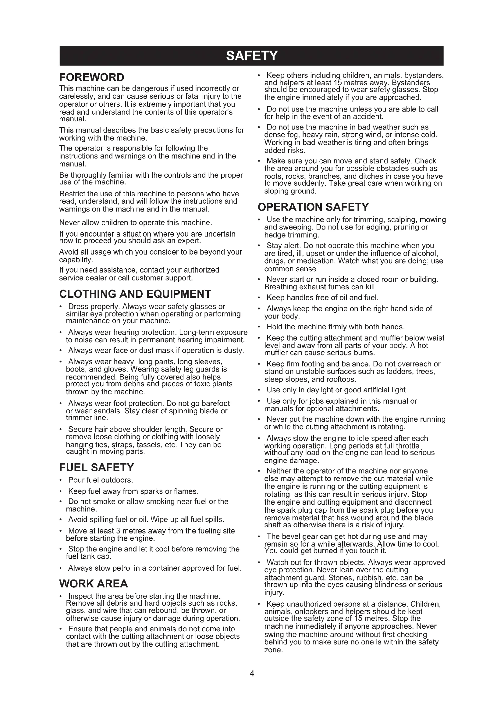 Do not smoke or allow smoking near fuel or the machine. Avoid spilling fuel or oil. Wipe up all fuel spills. Move at least 3 metres away from the fueling site before starting the engine. Stop the engine and let it cool before removing the fuel tank cap. Always stow petrol in a container approved for fuel. WORK AREA Inspect the area before starting the machine. 5HPRYHDOOGHEULVDQGKDUGREMHFWVVXFKDVURFNV glass, and wire that can rebound, be thrown, or otherwise cause injury or damage during operation. Ensure that people and animals do not come into contact with the cutting attachment or loose objects that are thrown out by the cutting attachment. Keep others including children, animals, bystanders, and helpers at least 15 metres away. Bystanders should be encouraged to wear safety glasses. Stop the engine immediately if you are approached. Do not use the machine unless you are able to call for help in the event of an accident. Do not use the machine in bad weather such as dense fog, heavy rain, strong wind, or intense cold. Working in bad weather is tiring and often brings added risks. Make sure you can move and stand safely. Check the area around you for possible obstacles such as roots, rocks, branches, and ditches in case you have to move suddenly. Take great care when working on sloping ground. OPERATION SAFETY Use the machine only for trimming, scalping, mowing and sweeping. Do not use for edging, pruning or hedge trimming. Stay alert. Do not operate this machine when you DUHWLUHGLOOXSVHWRUXQGHUWKHLQÀXHQFHRIDOFRKRO drugs, or medication. Watch what you are doing; use common sense. Never start or run inside a closed room or building. Breathing exhaust fumes can kill. Keep handles free of oil and fuel. Always keep the engine on the right hand side of your body.