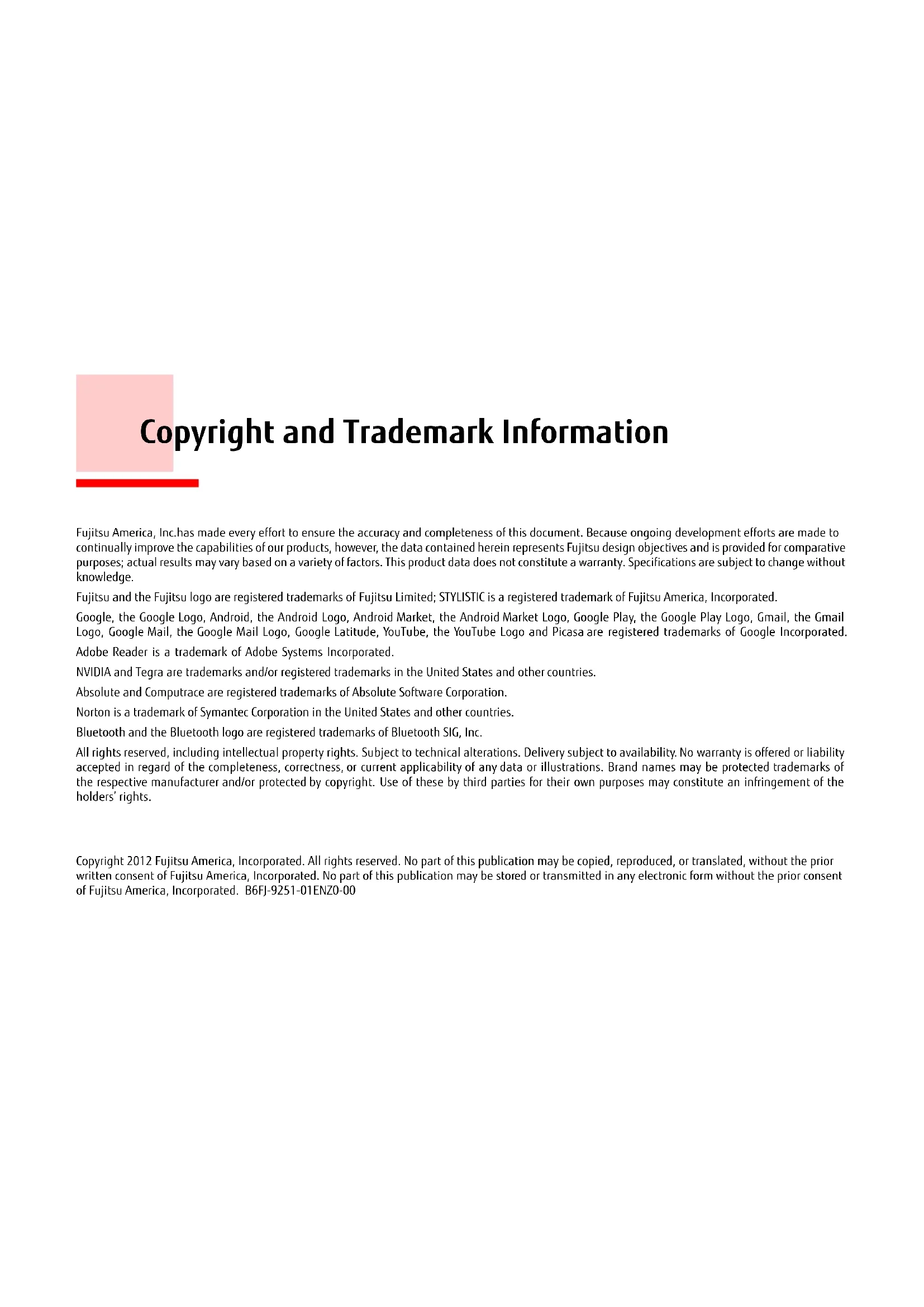 Copyright 2012 Fujitsu America, Incorporated. All rights reserved. No part of this publication may be copied, reproduced, or translated, without the prior written consent of Fujitsu America, Incorporated. No part of this publication may be stored or transmitted in any electronic form without the prior consent of Fujitsu America, Incorporated. B6FJ-9251-01ENZ0-00