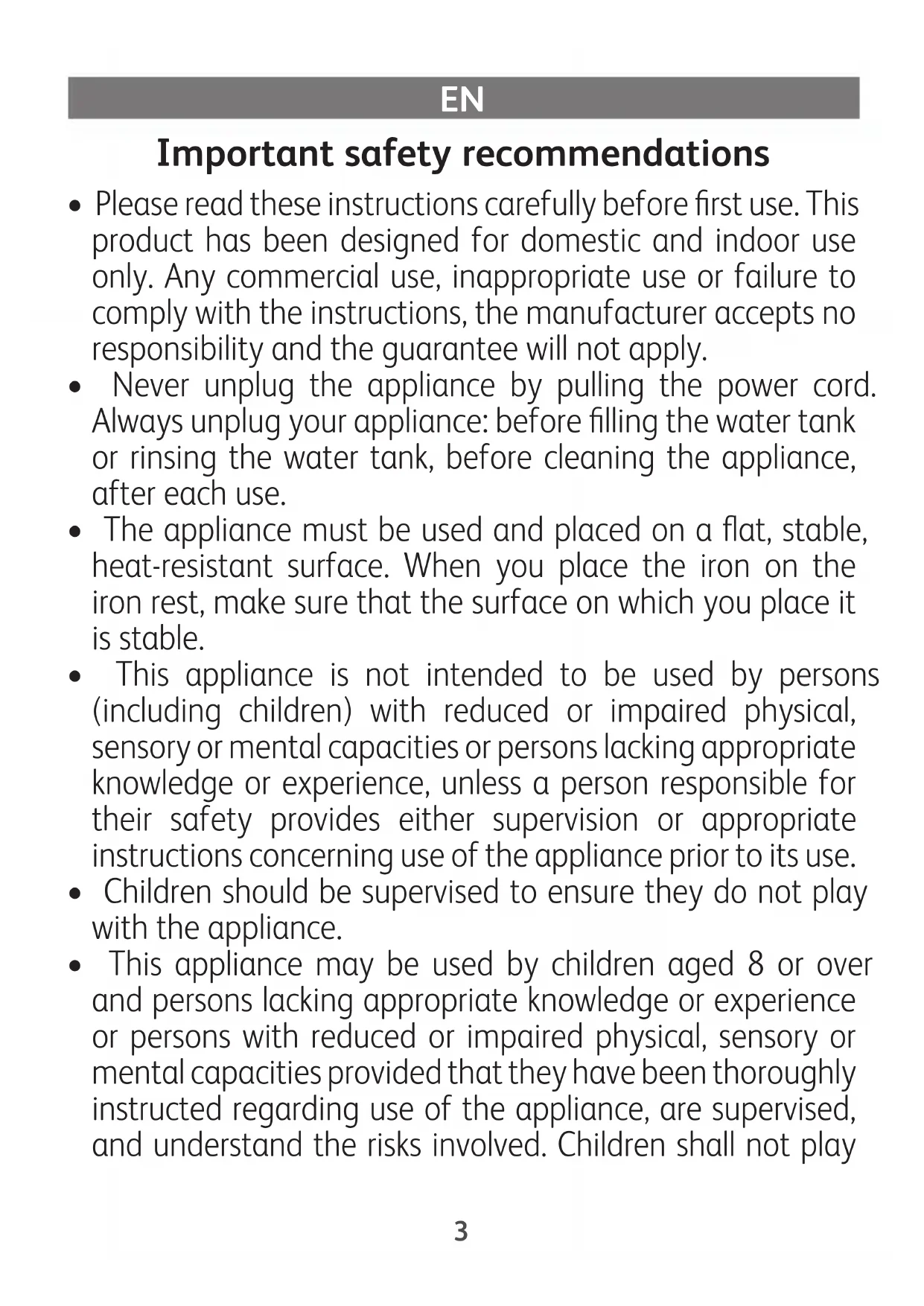 - This appliance may be used by children aged 8 or over and persons lacking appropriate knowledge or experience or persons with reduced or impaired physical, sensory or mental capacities provided that they have been thoroughly instructed regarding use of the appliance, are supervised, and understand the risks involved. Children shall not play 3with the appliance. Cleaning and user maintenance shall not be made by children without supervision. Keep the iron and its cord out of reach of children less than 8 years of age when it is energized or cooling down.