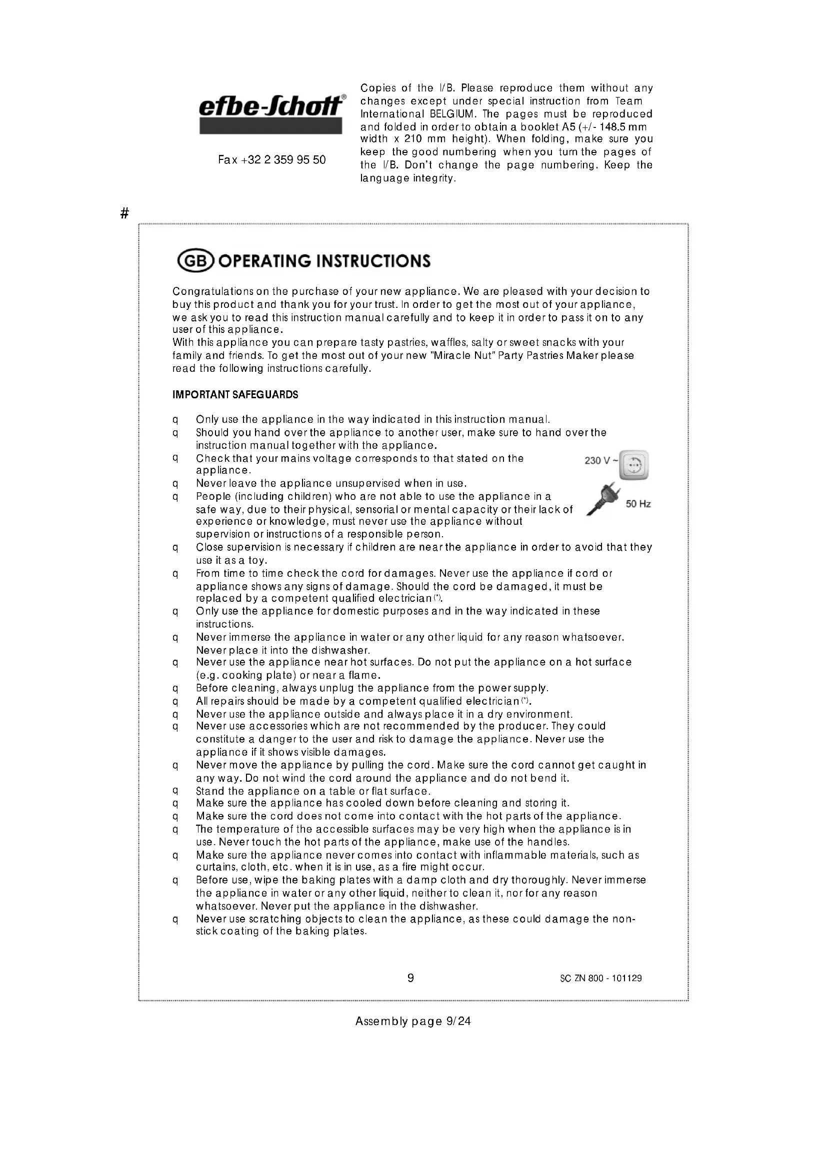 SC ZN 800 - 101129 Assembly page 9/24 Fax +32 2 359 95 50 Congratulations on the purchase of your new appliance. We are pleased with your decision to buy this product and thank you for your trust. In order to get the most out of your appliance, we ask you to read this instruction manual carefully and to keep it in order to pass it on to any user of this appliance. With this appliance you can prepare tasty pastries, waffles, salty or sweet snacks with your family and friends. To get the most out of your new "Miracle Nut" Party Pastries Maker please read the following instructions carefully. IMPORTANT SAFEGUARDS