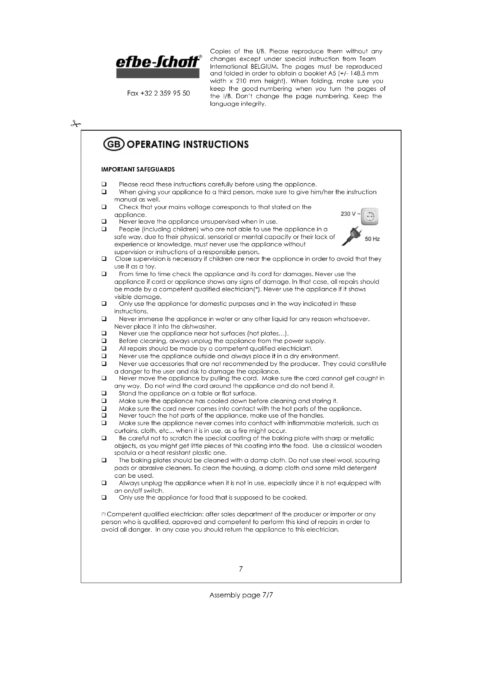 Copies of the I/B. Please reproduce them without any changes except under special instruction from Team International BELGIUM. The pages must be reproduced and folded in order to obtain a booklet A5 (+/- 148.5 mm width x 210 mm height). When folding, make sure you keep the good numbering when you turn the pages of the I/B. Don’t change the page numbering. Keep the language integrity.