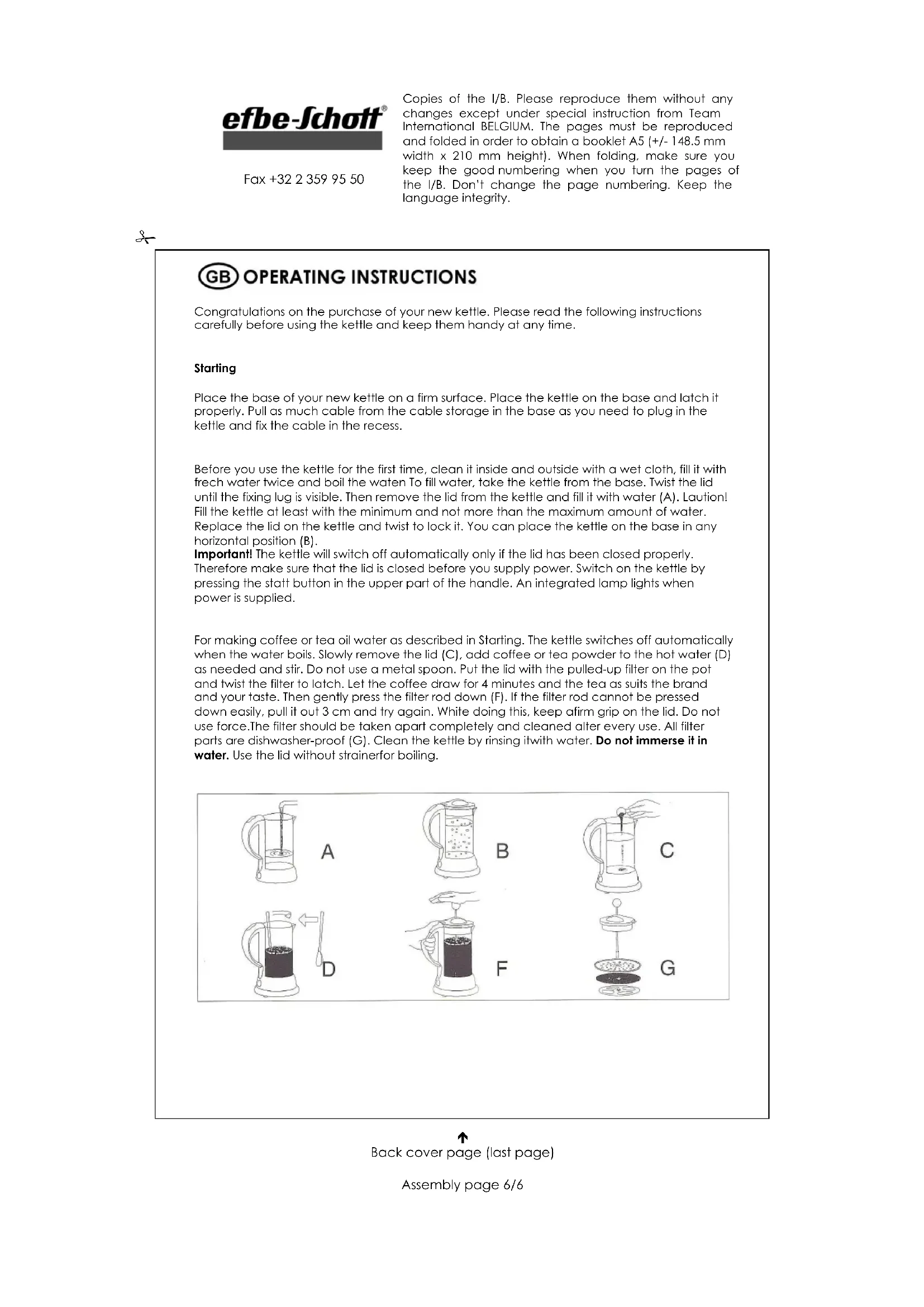 Copies of the I/B. Please reproduce them without any changes except under special instruction from Team International BELGIUM. The pages must be reproduced and folded in order to obtain a booklet A5 (+/- 148.5 mm width x 210 mm height). When folding, make sure you keep the good numbering when you turn the pages of the I/B. Don’t change the page numbering. Keep the language integrity.