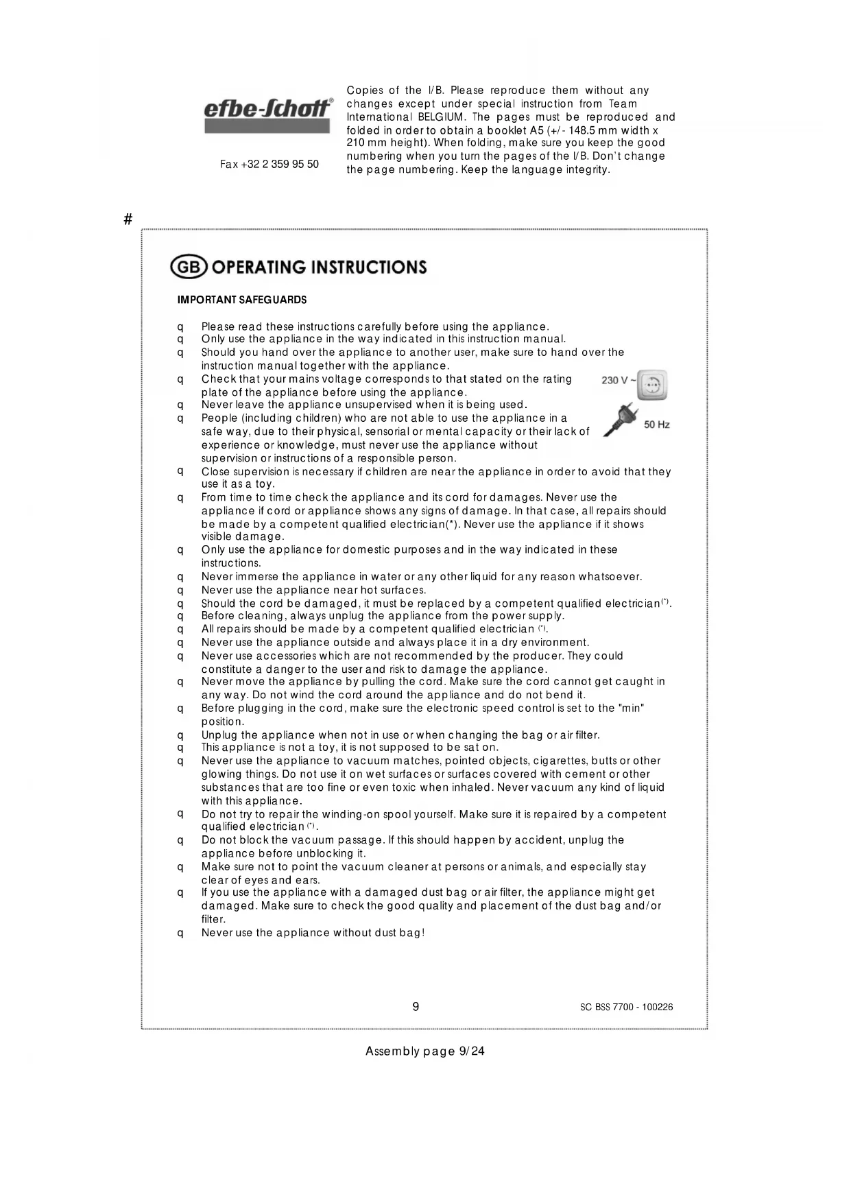 Copies of the I/B. Please reproduce them without any changes except under special instruction from Team International BELGIUM. The pages must be reproduced and folded in order to obtain a booklet A5 (+/- 148.5 mm width x 210 mm height). When folding, make sure you keep the good numbering when you turn the pages of the I/B. Don’t change the page numbering. Keep the language integrity. Front cover page (first page)Assembly page 1/24 Fax +32 2 359 95 50 Bodenstaubsauger Vacuum cleaner Aspirateur Stofzuiger Art. Nr. BSS 7700 230 V ~ 2500 W max I/B Version 100226# Copies of the I/B. Please reproduce them without any changes except under special instruction from Team International BELGIUM. The pages must be reproduced and folded in order to obtain a booklet A5 (+/- 148.5 mm width x 210 mm height). When folding, make sure you keep the good numbering when you turn the pages of the I/B. Don’t change the page numbering. Keep the language integrity.