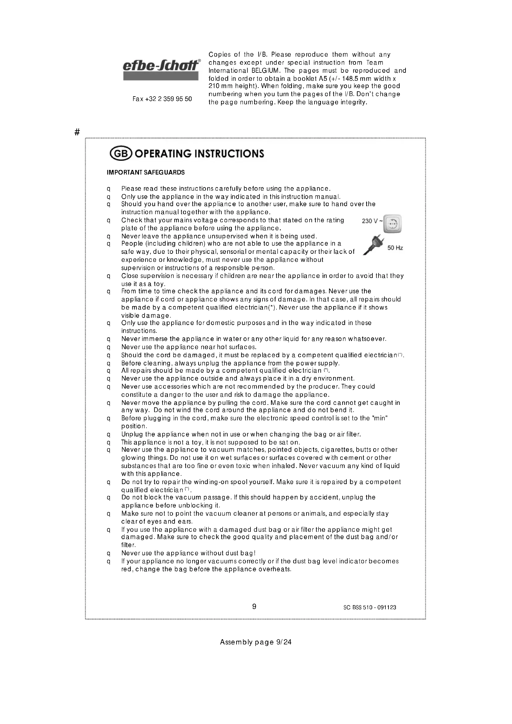 Copies of the I/B. Please reproduce them without any changes except under special instruction from Team International BELGIUM. The pages must be reproduced and folded in order to obtain a booklet A5 (+/- 148.5 mm width x 210 mm height). When folding, make sure you keep the good numbering when you turn the pages of the I/B. Don’t change the page numbering. Keep the language integrity. Front cover page (first page)Assembly page 1/24 Fax +32 2 359 95 50 Bodenstaubsauger Vacuum cleaner Aspirateur Stofzuiger I/B Version