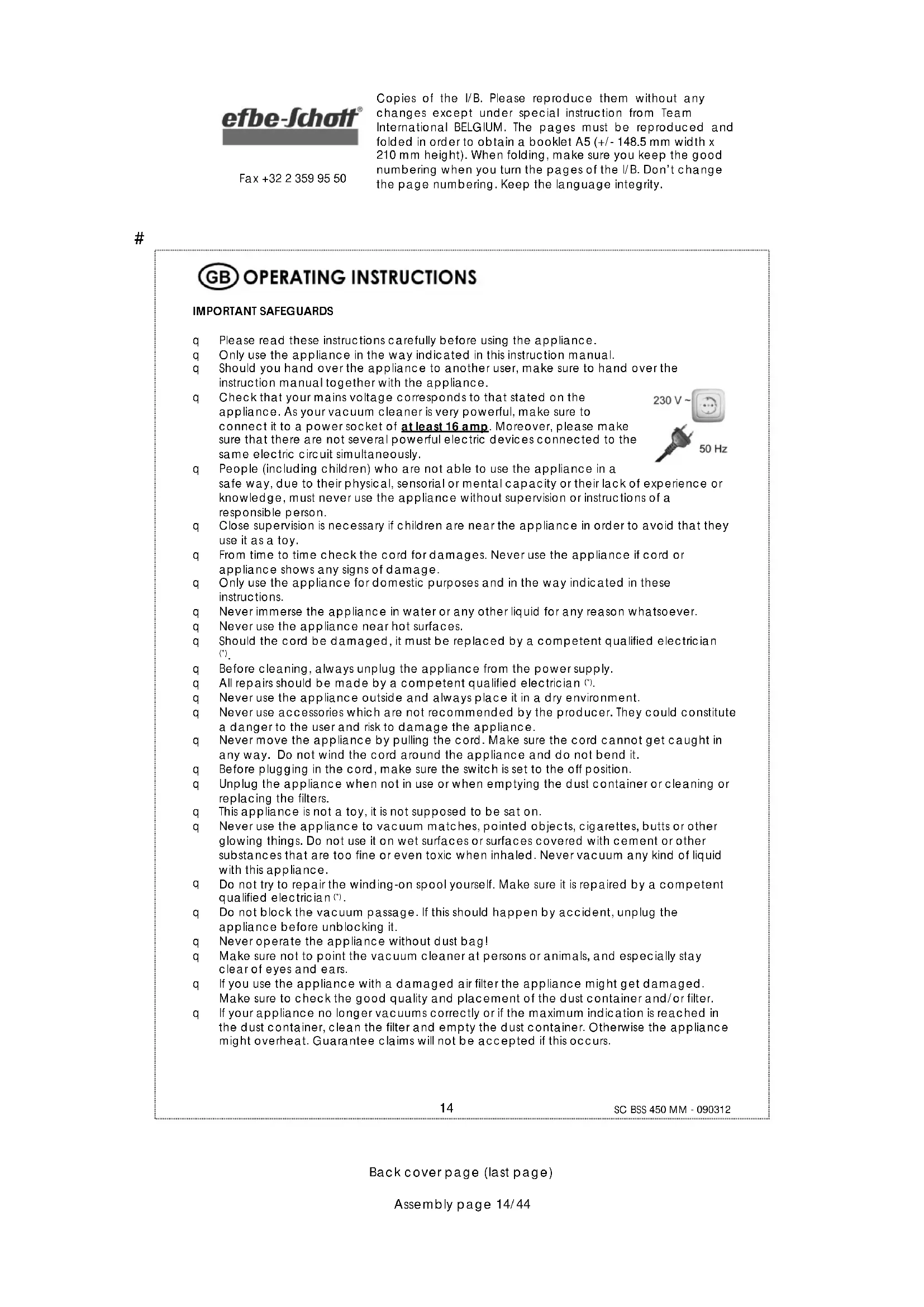 Copies of the I/B. Please reproduce them without any changes except under special instruction from Team International BELGIUM. The pages must be reproduced and folded in order to obtain a booklet A5 (+/- 148.5 mm width x 210 mm height). When folding, make sure you keep the good numbering when you turn the pages of the I/B. Don’t change the page numbering. Keep the language integrity. Front cover page (first page)Assembly page 1/44 Fax +32 2 359 95 50 Bodenstaubsauger Vacuum cleaner Aspirateur Stofzuiger Art. Nr. BSS 450MM 230 V ~ 2500 Wmax I/B Version 090312# Copies of the I/B. Please reproduce them without any changes except under special instruction from Team International BELGIUM. The pages must be reproduced and folded in order to obtain a booklet A5 (+/- 148.5 mm width x 210 mm height). When folding, make sure you keep the good numbering when you turn the pages of the I/B. Don’t change the page numbering. Keep the language integrity.