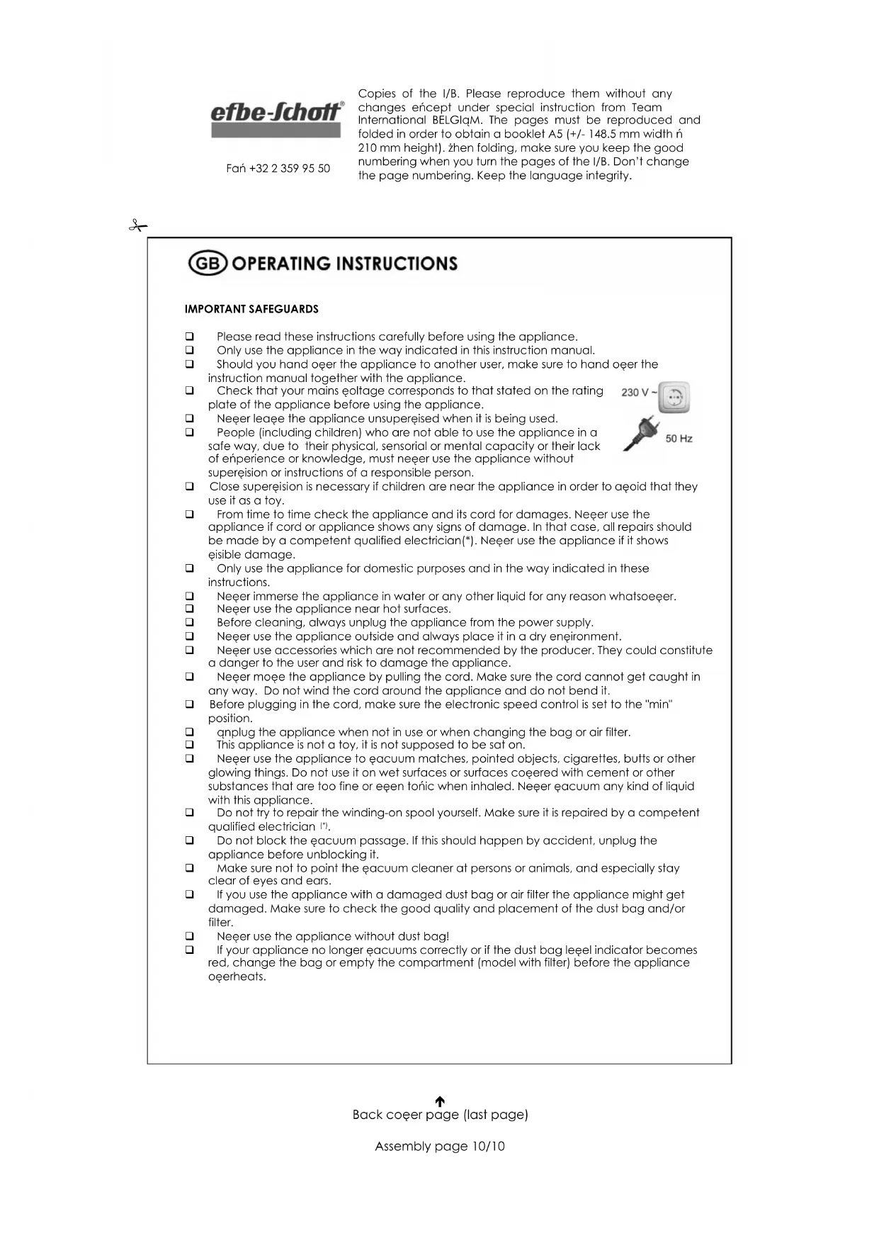 Copies of the I/B. Please reproduce them without any changes except under special instruction from Team International BELGIUM. The pages must be reproduced and folded in order to obtain a booklet A5 (+/- 148.5 mm width x 210 mm height). When folding, make sure you keep the good numbering when you turn the pages of the I/B. Don’t change the page numbering. Keep the language integrity.