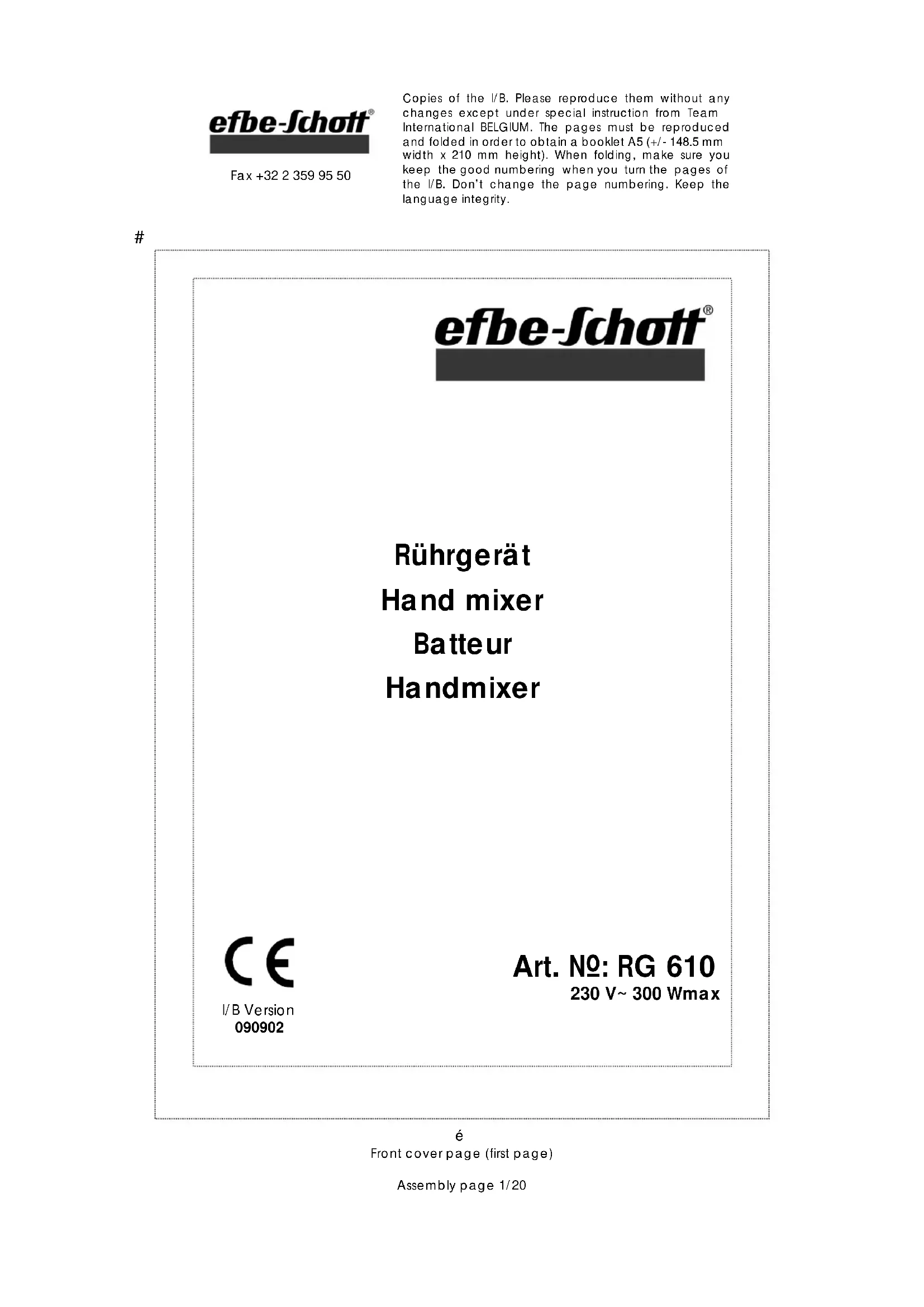 SC RG 610 – 090902 Assembly page 2/20 Fax +32 2 359 95 50# Copies of the I/B. Please reproduce them without any changes except under special instruction from Team International BELGIUM. The pages must be reproduced and folded in order to obtain a booklet A5 (+/- 148.5 mm width x 210 mm height). When folding, make sure you keep the good numbering when you turn the pages of the I/B. Don’t change the page numbering. Keep the language integrity.