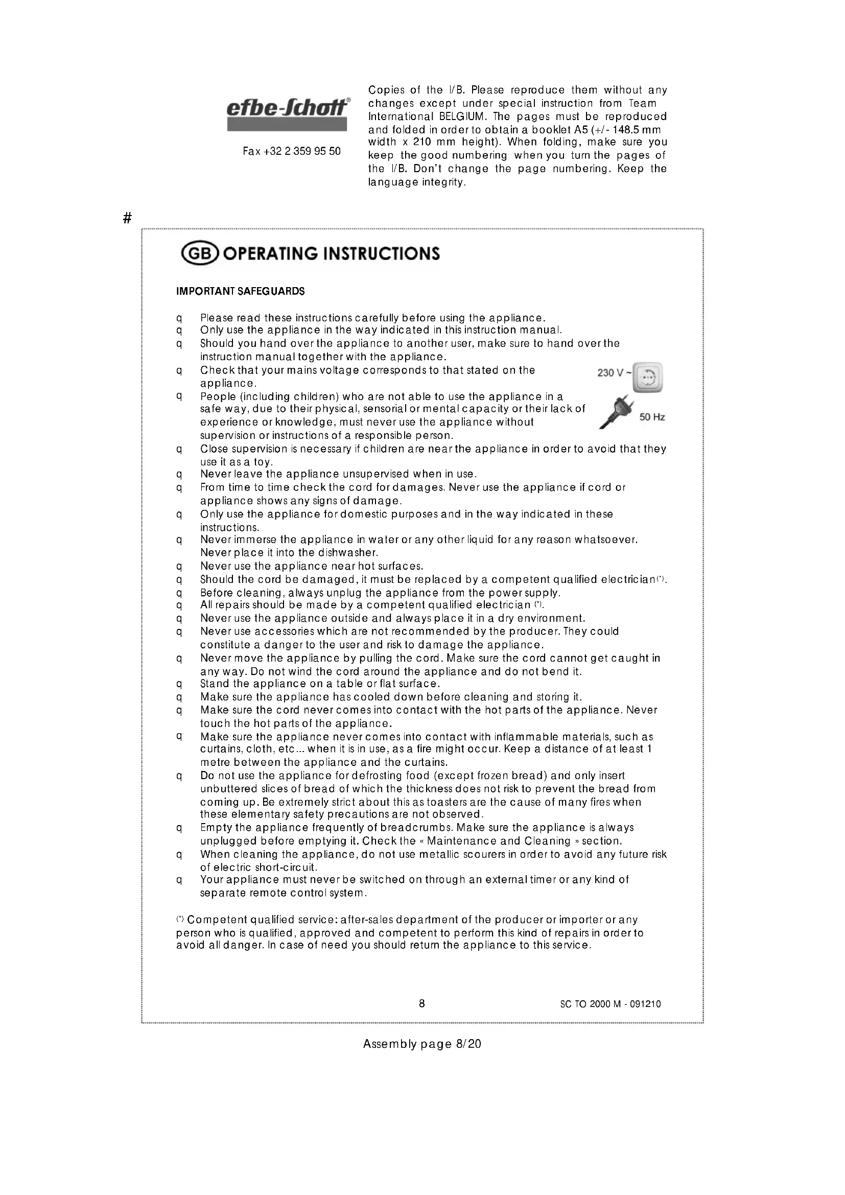 Competent qualified service: after-sales department of the producer or importer or any person who is qualified, approved and competent to perform this kind of repairs in order to avoid all danger. In case of need you should return the appliance to this service.# Copies of the I/B. Please reproduce them without any changes except under special instruction from Team International BELGIUM. The pages must be reproduced and folded in order to obtain a booklet A5 (+/- 148.5 mm width x 210 mm height). When folding, make sure you keep the good numbering when you turn the pages of the I/B. Don’t change the page numbering. Keep the language integrity.