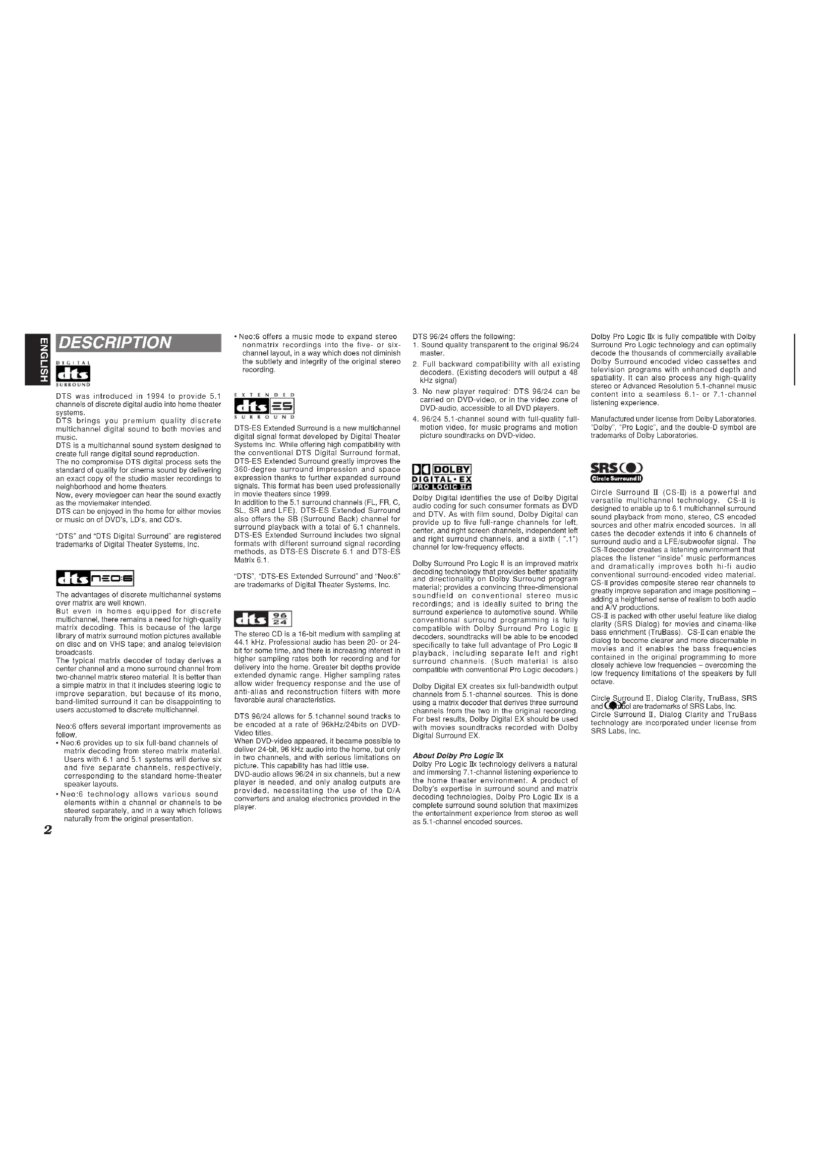 playback, including separate left and right surround channels. (Such material is also compatible with conventional Pro Logic decoders.) Dolby Digital EX creates six full-bandwidth output channels from 5.1-channel sources. This is done using a matrix decoder that derives three surround channels from the two in the original recording. For best results, Dolby Digital EX should be used with movies soundtracks recorded with Dolby Digital Surround EX. About Dolby Pro Logic IIx Dolby Pro Logic IIx technology delivers a natural and immersing 7.1-channel listening experience to the home theater environment. A product of Dolby's expertise in surround sound and matrix decoding technologies, Dolby Pro Logic II x is a complete surround sound solution that maximizes the entertainment experience from stereo as well as 5.1-channel encoded sources. DESCRIPTION DTS was introduced in 1994 to provide 5.1 channels of discrete digital audio into home theater systems. DTS brings you premium quality discrete multichannel digital sound to both movies and music. DTS is a multichannel sound system designed to create full range digital sound reproduction. The no compromise DTS digital process sets the standard of quality for cinema sound by delivering an exact copy of the studio master recordings to neighborhood and home theaters. Now, every moviegoer can hear the sound exactly as the moviemaker intended. DTS can be enjoyed in the home for either movies or music on of DVD’s, LD’s, and CD’s. “DTS” and “DTS Digital Surround” are registered trademarks of Digital Theater Systems, Inc. The advantages of discrete multichannel systems over matrix are well known. But even in homes equipped for discrete multichannel, there remains a need for high-quality matrix decoding. This is because of the large library of matrix surround motion pictures available on disc and on VHS tape; and analog television broadcasts. The typical matrix decoder of today derives a center channel and a mono surround channel from two-channel matrix stereo material. It is better than a simple matrix in that it includes steering logic to improve separation, but because of its mono, band-limited surround it can be disappointing to users accustomed to discrete multichannel. Neo:6 offers several important improvements as follow,